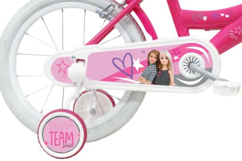 Barbie laat al jaren meisjeshartjes harder kloppen. Na de premiere van de film is de Barbie populairder dan ooit. Grote en kleine meisjes halen hun Barbie poppen weer tevoorschijn en leven hun eigen Barbie leven! Wil jij ook graag je Barbies showen, dan ben je met deze prachtige roze Barbie fiets zeker helemaal gelukkig! Het fietsje is voorzien van een mandje aan het stuur waarin Barbie en haar vriendinnen lekker kunnen zitten en staan. Aan de zadelbuis is een poppenzitje gemonteerd waar Barbie, Ken of een van je andere poppen graag in meerijden! De ‘Born to Play’ Barbie fietsenserie is een officieel Barbie product, met licentie. De fietsjes zijn voorzien van spaakwielen met luchtbanden, een gesloten kettingkast, een bel en caliperremmen op het voorwiel en het achterwiel. De fietsen zijn er in 3 maten: met 12 inch, 14 inch en 16 inch wielen. Alle hebben ze (afneembare) zijwieltjes, een mandje voor en een poppenzitje achter en zijn ze voorzien van die heerlijke roze Barbie kleur, met Barbie afbeeldingen. Het zadeltje, de remhendeltjes en de handgrepen met stootrandjes zijn op de maat van hun berijdsters aangepast. De 12 inch versie is geschikt voor kindjes vanaf ca 95 cm, leeftijd 2-4 jaar, kledingmaat 90 tot 105 De 14 inch versie is geschikt voor kindjes vanaf ca 100 cm, leeftijd 3-5 jaar, kledingmaat 98 tot 108 De 16 inch versie is geschikt voor kindjes vanaf ca 105 cm, leeftijd 4-6 jaar, kledingmaat 103 tot 118 Maak het geluk compleet en bestel zo’n schattig Barbie fietsje voor je kindje of kleinkindje! Op deze fietsjes kan het kind veilig leren fietsen – we raden aan de kleintjes niet aan het verkeer te laten deelnemen, maar op een afgesloten pleintje of op de stoep onder toezicht van een ouder kan het kind haar – of zijn – eerste meters op een fietsje maken.