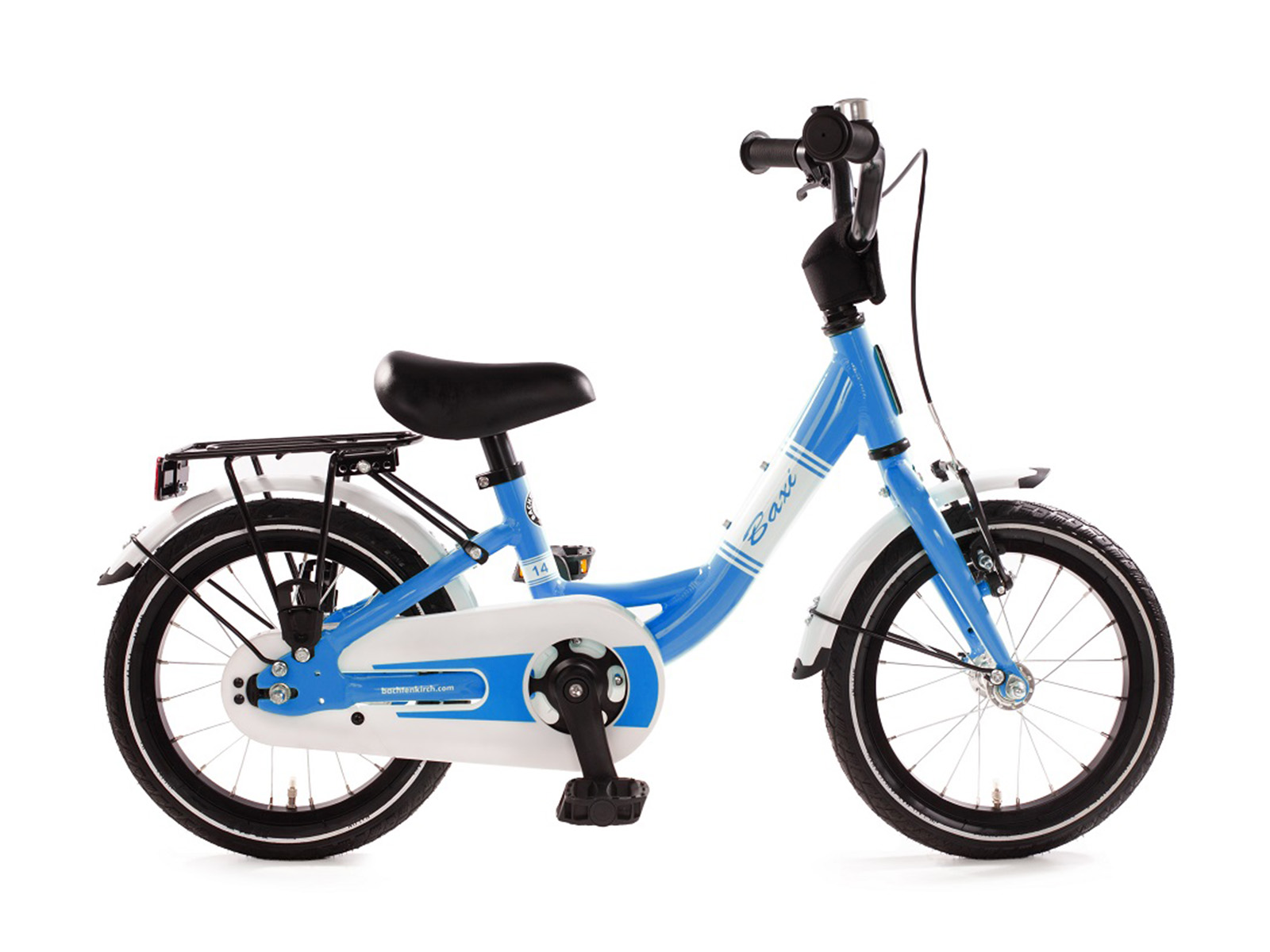 De frames van de nieuwe Baxi kinderfietsen zijn gemaakt van aluminium. Hierdoor zijn ze aanzienlijk lichter dan de klassieke stalen modellen. De Baxi-serie bestaat uit fietsjes in drie wielmaten met diverse aspecten die het rijden ermee veiliger maken, zoals met name de lage frame-doorstap en de traditionele terugtrapremnaaf. De bel, een zijstandaard, spatborden, de neopreen stuurpolstering, reflectoren voor en achter en de bagagedrager worden ook standaard meegeleverd. De zwart geanodiseerde aluminium velgen zijn voorzien van reflecterende banden. De bagagedrager kan eenvoudig worden gemonteerd indien gewenst. Bij kinderen die nog maar net groot genoeg zijn voor de gekozen wilelmaat kan het raadzaam zijn de bagagedrager niet te monteren, omdat in dat geval het zadel zo’n 2 centimeter lager kan worden gezet. Het zadel en stuur van de Baxi kinderfietsen kunnen versteld worden voor een optimale aanpassing aan de lengte van de berijder. Let op! De Baxi fietsjes worden zonder zijwieltjes geleverd. Het gebruik ervan is een beetje omstreden, omdat juist het balanceren op slechts twee wielen aangeleerd moet worden. Er zijn echter wel zijwieltjes verkrijgbaar die eenvoudig kunnen worden gemonteerd, indien u er toch voor kiest het fietsje ermee uit te rusten. De 14 inch serie is geschikt voor kinderen vanaf ca 2,5 jaar oud, met een lichaamslengte vanaf 101 cm en een binnenbeen lengte van minstens 42 cm. De 16 inch serie is geschikt voor kinderen vanaf ca 3 jaar oud, met een lichaamslengte vanaf 104 cm en een binnenbeen lengte van minstens 44 cm. De 18 inch serie is geschikt voor kinderen vanaf ca 4 jaar oud, met een lichaamslengte vanaf 112 cm en een binnenbeen lengte van minstens 49 cm. Voor de veiligheid van het kind kunt u beter niet ‘op de groei’ kopen , omdat juist aan het begin van de fietscarriere het kind zich zeker en fijn moet voelen op het fietsje. Omdat het zadel en het stuur verstelbaar zijn kan het kind er langere tijd gebruik van maken. Bachtenkirch fietsjes zijn heel degelijk gebouwd en kunnen, wanneer het fietsje toch te klein is geworden, nog prima een tweede of derde leven leiden bij een jonger broertje of zusje, bij neefjes of nichtjes of na verkoop aan een andere ouder.