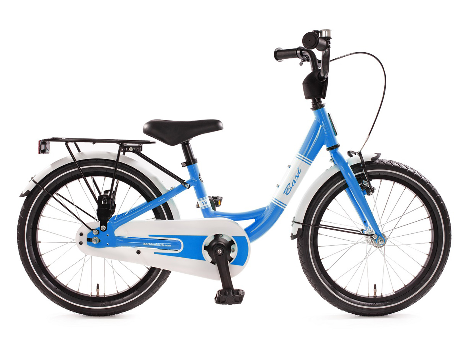 De frames van de nieuwe Baxi kinderfietsen zijn gemaakt van aluminium. Hierdoor zijn ze aanzienlijk lichter dan de klassieke stalen modellen. De Baxi-serie bestaat uit fietsjes in drie wielmaten met diverse aspecten die het rijden ermee veiliger maken, zoals met name de lage frame-doorstap en de traditionele terugtrapremnaaf. De bel, een zijstandaard, spatborden, de neopreen stuurpolstering, reflectoren voor en achter en de bagagedrager worden ook standaard meegeleverd. De zwart geanodiseerde aluminium velgen zijn voorzien van reflecterende banden. De bagagedrager kan eenvoudig worden gemonteerd indien gewenst. Bij kinderen die nog maar net groot genoeg zijn voor de gekozen wilelmaat kan het raadzaam zijn de bagagedrager niet te monteren, omdat in dat geval het zadel zo’n 2 centimeter lager kan worden gezet. Het zadel en stuur van de Baxi kinderfietsen kunnen versteld worden voor een optimale aanpassing aan de lengte van de berijder. Let op! De Baxi fietsjes worden zonder zijwieltjes geleverd. Het gebruik ervan is een beetje omstreden, omdat juist het balanceren op slechts twee wielen aangeleerd moet worden. Er zijn echter wel zijwieltjes verkrijgbaar die eenvoudig kunnen worden gemonteerd, indien u er toch voor kiest het fietsje ermee uit te rusten. De 14 inch serie is geschikt voor kinderen vanaf ca 2,5 jaar oud, met een lichaamslengte vanaf 101 cm en een binnenbeen lengte van minstens 42 cm. De 16 inch serie is geschikt voor kinderen vanaf ca 3 jaar oud, met een lichaamslengte vanaf 104 cm en een binnenbeen lengte van minstens 44 cm. De 18 inch serie is geschikt voor kinderen vanaf ca 4 jaar oud, met een lichaamslengte vanaf 112 cm en een binnenbeen lengte van minstens 49 cm. Voor de veiligheid van het kind kunt u beter niet ‘op de groei’ kopen , omdat juist aan het begin van de fietscarriere het kind zich zeker en fijn moet voelen op het fietsje. Omdat het zadel en het stuur verstelbaar zijn kan het kind er langere tijd gebruik van maken. Bachtenkirch fietsjes zijn heel degelijk gebouwd en kunnen, wanneer het fietsje toch te klein is geworden, nog prima een tweede of derde leven leiden bij een jonger broertje of zusje, bij neefjes of nichtjes of na verkoop aan een andere ouder.