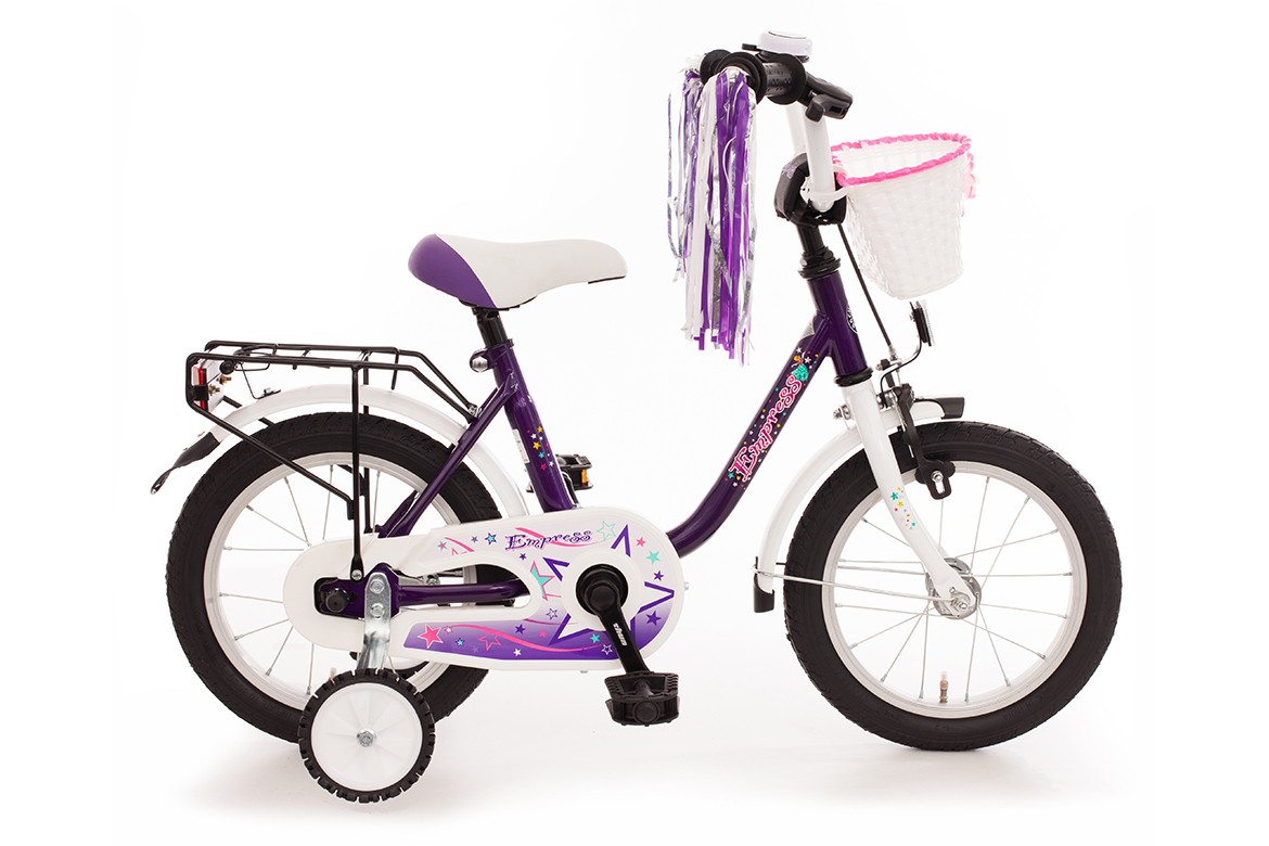 **Empress, mooie fietsjes om veilig te leren fietsen.** Een eerste echte fiets! Wat een grote stap in een kinderleven. Zo’n prachtig glimmend apparaat waarmee je je wereld kunt verkennen en zelfstandig naar je vriendjes en vriendinnetjes kunt fietsen! Een grootse ervaring, het begin van nieuwe avonturen en ontdekkingen. Als ouder wil je er dan de garantie dat dat fietsje voldoet aan alle veiligheidseisen, dat de kwaliteit zo goed is dat het fietsje jarenlang kan functioneren en dat je kind er veilig en verantwoord mee onderweg kan gaan. Met de fietsjes van Bachtenkirch kunt u daarvan op aan. Kinderen vanaf pakweg 3 jaar kunnen op een fietsje met 12 inch wieltjes beginnen met fietsen. Ze kunnen er dan tot hun vijfde op blijven rijden. De 14 inch is er voor kinderen van 4 tot 6 jaar, die van 16 inch voor 5 tot 7 jaar en de 18 inch modellen voor 6 tot 8 jaar. Natuurlijk ligt het aan de lengte van het kind welke fiets het beste past. De Empress serie van Bachtenkirch bestaat uit stoere fietsjes in 4 frame/wielmaten. De fietsjes hebben comfortabele luchtbanden, een stevig frame, wielen en trapas met kogellagers, aluminium velgen, kettingkast en metalen spatbordjes. Zadel- en stuurhoogte zijn instelbaar. De fiets is voorzien van een mand en handvatten met franje. De 12 en 14 inch fietsjes zijn voorzien van zijwieltjes, die afneembaar zijn wanneer de berijder zeker genoeg fietst. De 16 en 18 inch modellen hebben een zijstandaard, zodat de fiets makkelijk geparkeerd kan worden. De Empress serie is geschikt voor meisjes en jongens maar richt zich vooral op feetjes door de kleurstelling en sterrenstof decals. De Duitse firma Bachtenkirch maakt al vele tientallen jaren kinderfietsen en heeft hierbij een hoge graad van perfectie bereikt. Zij scoren dan ook hoog op betrouwbaarheid, veiligheid en kwaliteit. Wanneer u een goede, stoere fiets wil voor uw kind maar niet te duur uit wilt zijn is de Empress serie een perfecte keuze. De fietsjes gaan vele jaren mee als u ze een beetje aandacht en onderhoud geeft, zodat ook broertjes of zusjes, neefjes, nichtjes of buurkinderen er nog veel plezier van kunnen beleven als uw kindje er te groot voor is geworden. **Kenmerken:** – Terugtraprem en V-brake op voorwiel – Reflectoren aan voor- en achterkant – Bel – Gepolsterd stuur – Gesloten kettingkast – Metalen spatborden – Gevlochten kunststof mand – Kwaliteitstrapas van Thun Zithoogte: 12 inch: 44-50 cm, 14 inch: 46-55 cm, 16 inch: 53-58 cm en 18 inch 55-61 cm.