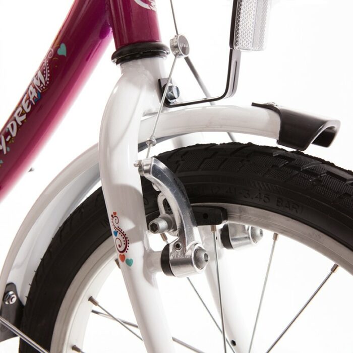 **My Dream, een droom van een fietsje om veilig te leren fietsen.** Een eerste echte fiets! Wat een grote stap in een kinderleven. Zo’n prachtig glimmend apparaat waarmee je je wereld kunt verkennen en zelfstandig naar je vriendjes en vriendinnetjes kunt fietsen! Een grootse ervaring, het begin van nieuwe avonturen en ontdekkingen. Als ouder wil je er dan de garantie dat dat fietsje voldoet aan alle veiligheidseisen, dat de kwaliteit zo goed is dat het fietsje jarenlang kan functioneren en dat je kind er veilig en verantwoord mee onderweg kan gaan. Met de fietsjes van Bachtenkirch kunt u daarvan op aan. Kinderen vanaf pakweg 3 jaar kunnen op een fietsje met 12 inch wieltjes beginnen met fietsen. Ze kunnen er dan tot hun vijfde op blijven rijden. De 14 inch is er voor kinderen van 4 tot 6 jaar. De 16 inch voor 5 tot 7 jaar en de 18 inch modellen voor 6 tot 8 jaar hebben een Waveframe met tussenbuisje. Natuurlijk ligt het aan de lengte van het kind welke fiets het beste past. De My Dream serie van Bachtenkirch bestaat uit stoere fietsjes in 4 frame/wielmaten en twee kleuren. De fietsjes hebben comfortabele luchtbanden, een stevig frame, wielen en trapas met kogellagers, aluminium velgen, kettingkast en metalen spatbordjes. Zadel- en stuurhoogte zijn instelbaar. De fiets is voorzien van een mandje aan het stuur. De 12 en 14 inch fietsjes zijn voorzien van zijwieltjes, die afneembaar zijn wanneer de berijder zeker genoeg fietst. De 16 en 18 inch modellen hebben een zijstandaard, zodat de fiets makkelijk geparkeerd kan worden. De My Dream serie is geschikt voor meisjes en jongens maar richt zich vooral op meisjes door de kleurstelling en het mandje. De Duitse firma Bachtenkirch maakt al vele tientallen jaren kinderfietsen en heeft hierbij een hoge graad van perfectie bereikt. Zij scoren dan ook hoog op betrouwbaarheid, veiligheid en kwaliteit. Wanneer u een goede, stoere fiets wil voor uw kind maar niet te duur uit wilt zijn is de My Dream een perfecte keuze. De fietsjes gaan vele jaren mee als u ze een beetje aandacht en onderhoud geeft, zodat ook broertjes of zusjes, neefjes, nichtjes of buurkinderen er nog veel plezier van kunnen beleven als uw kindje er te groot voor is geworden. **Kenmerken:** – Terugtraprem en V-brake op voorwiel – Reflectoren aan voor- en achterkant – Bel – Gepolsterd stuur – Gesloten kettingkast – Metalen spatborden – Gevlochten kunststof mand – Kwaliteitstrapas van Thun Zithoogte: 12 inch: 44-50 cm, 14 inch: 46-55 cm, 16 inch: 51-57 cm en 18 inch 58-62 cm.