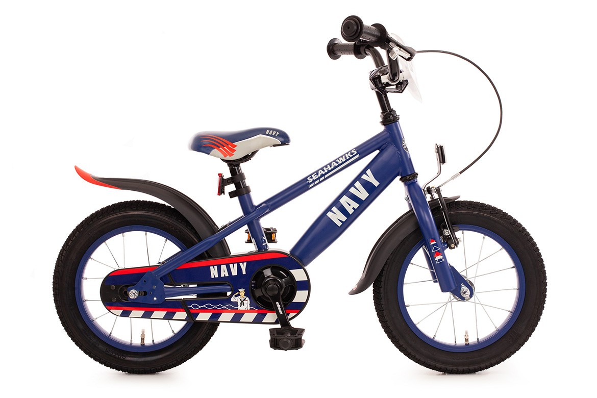 **Navy, stoere fietsjes voor een veilig begin van de fietscarriere.** Een eerste echte fiets! Wat een grote stap in een kinderleven. Zo’n prachtig glimmend apparaat waarmee je je wereld kunt verkennen en zelfstandig naar je vriendjes en vriendinnetjes kunt fietsen! Een grootse ervaring, het begin van nieuwe avonturen en ontdekkingen. Als ouder wil je er dan de garantie dat dat fietsje voldoet aan alle veiligheidseisen, dat de kwaliteit zo goed is dat het fietsje jarenlang kan functioneren en dat je kind er veilig en verantwoord mee onderweg kan gaan. Met de fietsjes van Bachtenkirch kunt u daarvan op aan. De 14 inch is er voor kinderen van 3 tot 5 jaar, die van 16 inch voor 4 tot 6 jaar en de 18 inch modellen voor 5 tot 7 jaar. Natuurlijk ligt het aan de lengte van het kind welke fiets het beste past. De Navy serie van Bachtenkirch bestaat uit stoere fietsjes in 3 frame/wielmaten. De fietsjes hebben stoere dikke banden, een stevig MTB frame, wielen en trapas met kogellagers, aluminium velgen, kettingkast en kunststof spatbordjes. Zadel- en stuurhoogte zijn instelbaar. De fietsjes zijn voorzien van een zijstandaard, zodat de fiets makkelijk geparkeerd kan worden. Er is een mogelijkheid om zijwieltjes te monteren. Deze worden niet meegeleverd. De Duitse firma Bachtenkirch maakt al vele tientallen jaren kinderfietsen en heeft hierbij een hoge graad van perfectie bereikt. Zij scoren dan ook hoog op betrouwbaarheid, veiligheid en kwaliteit. De fietsjes gaan vele jaren mee als u ze een beetje aandacht en onderhoud geeft, zodat ook broertjes of zusjes, neefjes, nichtjes of buurkinderen er nog veel plezier van kunnen beleven als uw kindje er te groot voor is geworden. **Kenmerken:** – Terugtraprem en V-brake op voorwiel – Reflectoren aan voor- en achterkant – Bel – Gepolsterd stuur – Gesloten kettingkast – Kunststof spatborden – Cross stuurschild – Kwaliteitstrapas van Thun Zithoogte: 14 inch: 48-53 cm, 16 inch: 51-56 cm en 18 inch 53-58 cm.