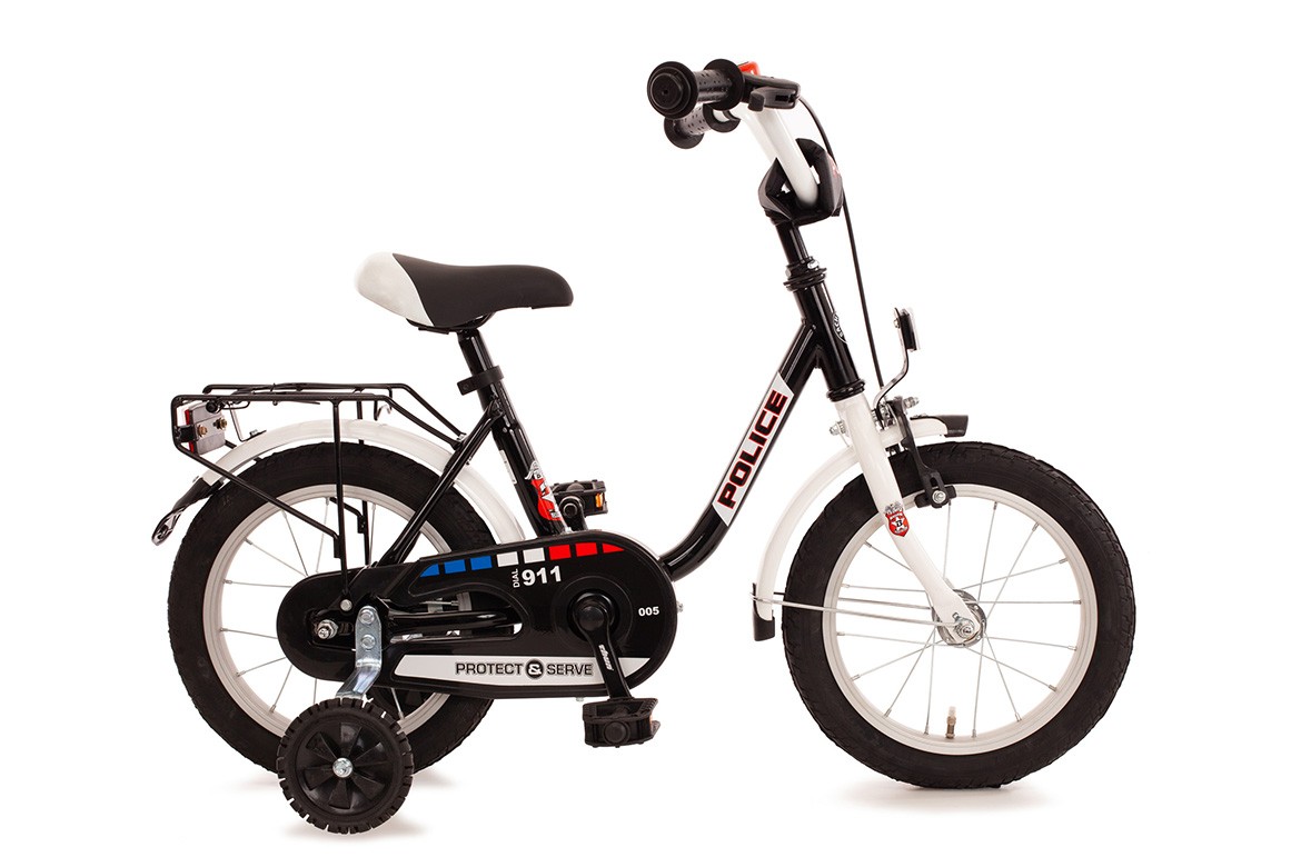 **Police, stoere en sterke fietsjes voor een veilig begin van de fietscarriere.** Een eerste echte fiets! Wat een grote stap in een kinderleven. Zo’n prachtig glimmend apparaat waarmee je je wereld kunt verkennen en zelfstandig naar je vriendjes en vriendinnetjes kunt fietsen! Een grootse ervaring, het begin van nieuwe avonturen en ontdekkingen. Als ouder wil je er dan de garantie dat dat fietsje voldoet aan alle veiligheidseisen, dat de kwaliteit zo goed is dat het fietsje jarenlang kan functioneren en dat je kind er veilig en verantwoord mee onderweg kan gaan. Met de fietsjes van Bachtenkirch kunt u daarvan op aan. De 12 inch versie is er voor kinderen van 3 tot 5 jaar, de 14 inch is er voor kinderen van 4 tot 6 jaar, die van 16 inch voor 5 tot 7 jaar en de 18 inch modellen voor 6 tot 8 jaar. Natuurlijk ligt het aan de lengte van het kind welke fiets het beste past. De Police serie van Bachtenkirch bestaat uit stoere zwart witte fietsjes met Amerikaanse politie bestickering in 4 frame/wielmaten. De fietsjes hebben luchtbanden banden, witte aluminium velgen, een stevig lage instap frame, wielen en trapas met kogellagers, een gesloten kettingkast en stalen spatbordjes. De zadel- en stuurhoogte is instelbaar. Alle Police fietsjes worden met zijwieltjes geleverd. De Duitse firma Bachtenkirch maakt al vele tientallen jaren kinderfietsen en heeft hierbij een hoge graad van perfectie bereikt. Zij scoren dan ook hoog op betrouwbaarheid, veiligheid en kwaliteit. De fietsjes gaan vele jaren mee als u ze een beetje aandacht en onderhoud geeft, zodat ook broertjes of zusjes, neefjes, nichtjes of buurkinderen er nog veel plezier van kunnen beleven als uw kindje er te groot voor is geworden. **Kenmerken:** – Terugtraprem en V-brake op voorwiel – Reflectoren aan voor- en achterkant – Bel – Gepolsterd stuur – Gesloten kettingkast – Metalen spatborden – Kwaliteitstrapas van Thun – Zijwieltjes Zithoogte: 12 inch: 44-50 cm, 14 inch: 46-55 cm, 16 inch: 51-57 cm en 18 inch 58-62 cm.
