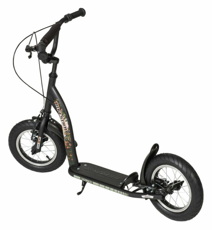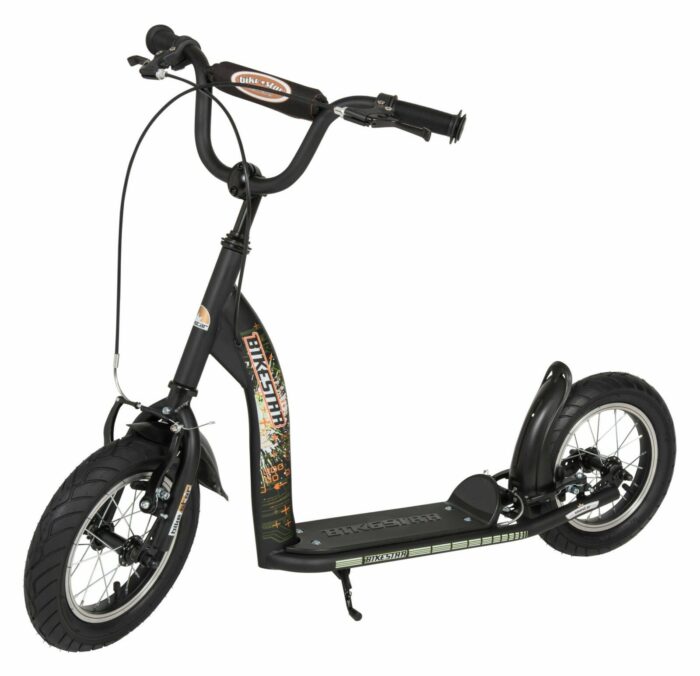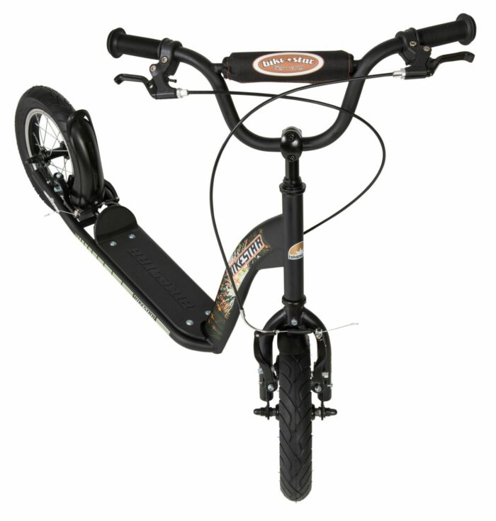 **Bikestar kwaliteit** Een step is fantastisch speelgoed voor een kind – en wanneer het model het toelaat ook voor volwassenen. Het vergroot de wereld, als je het steppen eenmaal onder de knie hebt kun je snel en met weinig inspanning hele afstanden afleggen. Je leert spelenderwijs je evenwicht houden, verkeerssituaties inschatten, omgaan met snelheid, sturen en afremmen. Daarvoor moet het stepje wel van goede kwaliteit zijn. Wees gerust, steps van Bikestar zijn oerdegelijk gebouwd en voldoen aan alle veiligheidseisen. Daarbij heeft Bikestar een assortiment van steps dat een grote variatie kent in wielmaten, kleuren en typen steps, zodat er altijd wel een is die precies voldoet aan uw of uw kinds wensen. **Dit model heeft de volgende kenmerken:** Zeer stabiel en multi-gecoat stalen buisframe met slagvaste kleur! Deze step voldoet aan alle normen en vereisten van de EU. Absoluut kindvriendelijk! De step stuurt licht, is duurzaam en gaat lang mee. De step is veilig, met schone lasnaden, geen scherpe hoeken of randen. De step heeft ook een kindvriendelijke handrem voor extra veiligheid tijdens het spelen. Langdurig plezier gegarandeerd, met 12 inch luchtbanden op hoogwaardige, kogelgelagerde spaakvelgen. **Specificaties** – Stabiel stalen frame met meerdere slagvaste laklagen – Spatborden op voor- en achterwiel: geen vieze kleding – Handremmen op voor- en achterwiel met kindermaat handgrepen – In hoogte en hoek verstelbaar kogelgelagerd stuur – Gifvrije veiligheidshandgrepen en stuurpolstering – Antislip voetbord en stabiele zijstandaard – Remleidingen veilig weggewerkt binnen het frame