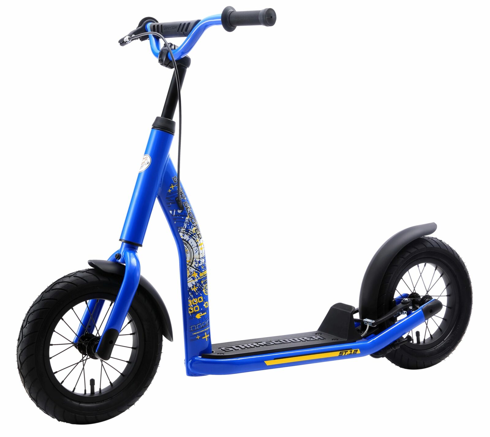 **Bikestar kwaliteit** Een step is fantastisch speelgoed voor een kind – en wanneer het model het toelaat ook voor volwassenen. Het vergroot de wereld, als je het steppen eenmaal onder de knie hebt kun je snel en met weinig inspanning hele afstanden afleggen. Je leert spelenderwijs je evenwicht houden, verkeerssituaties inschatten, omgaan met snelheid, sturen en afremmen. Daarvoor moet het stepje wel van goede kwaliteit zijn. Wees gerust, steps van Bikestar zijn oerdegelijk gebouwd en voldoen aan alle veiligheidseisen. Daarbij heeft Bikestar een assortiment van steps dat een grote variatie kent in wielmaten, kleuren en typen steps, zodat er altijd wel een is die precies voldoet aan uw of uw kinds wensen. **Dit model heeft de volgende kenmerken:** Zeer stabiel en multi-gecoat stalen buisframe met slagvaste kleur! Deze step voldoet aan alle normen en vereisten van de EU. Absoluut kindvriendelijk! De step stuurt licht, is duurzaam en gaat lang mee. De step is veilig, met schone lasnaden, geen scherpe hoeken of randen. De step heeft ook een kindvriendelijke handrem voor extra veiligheid tijdens het spelen. Langdurig plezier gegarandeerd, met 12 inch luchtbanden op hoogwaardige, kogelgelagerde spaakvelgen. **Specificaties** – 12 inch luchtbanden voor lekkere vering op solide velgen – Stabiel stalen frame met meerdere slagvaste laklagen – Spatborden op voor- en achterwiel: geen vieze kleding – Handrem op achterwiel met kindermaat handgrepen – In hoogte en hoek verstelbaar kogelgelagerd stuur – Gifvrije veiligheidshandgrepen en stuurpolstering – Antislip voetbord, zijstandaard en veiligheidsmoeren op de assen – Remleidingen veilig weggewerkt binnen het frame