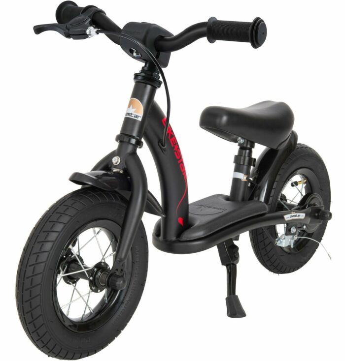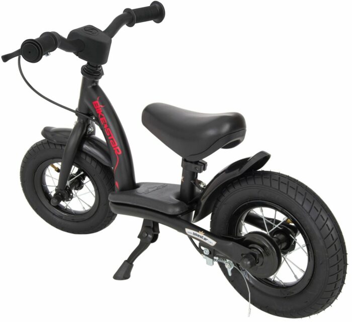 **De eerste stapjes van je kind of kleinkind zijn een wonder, niet in het minst voor het kindje zelf.** Ineens is er veel meer van de omgeving te zien en het kind valt van de ene verwondering in de andere. De eerste stapjes gaan moeizaam, met vallen en opstaan, maar al snel heeft je kindje de smaak te pakken en wil het je overal volgen, of misschien zelfs een eigen weg gaan. Tegen die tijd kan je overwegen het eerste loopfietsje aan te schaffen. Een loopfietsje leert het kindje het evenwicht bewaren, omgaan met de omgeving, sneller bewegen dan lopen en levert daarbij een hele hoop plezier. Bikestar, een bekende fabrikant uit Duitsland, biedt een keur aan loopfietsjes aan. Van hout, van aluminium en andere metalen, met massieve bandjes en luchtbandjes. Voor de allerjongste en ondernemende kinderen vanaf 18 maanden zijn er tot tweewielers om te bouwen driewielers. Voor de stoertjes zijn er MTB-loopfietsjes met 12 inch wielen. Het aanbod is kleurrijk en heel divers, maar altijd is er gelet op de grootste veiligheid in materiaalkeuze, bouwkwaliteit en ergonomie. Een feest voor het kind, een hele geruststelling voor de (groot)ouders. **Licht, stabiel en veilig** Dit loopfietsje weegt niet veel maar is toch stabiel en veilig. Het kind kan met dit fietsje beginnen de wereld te ontdekken. Alle gebruikte materialen, ook de lak en handgrepen, voldoen aan de wettelijke normen van veiligheid en zijn dus gifvrij en van onberispelijke kwaliteit. **Een fantastische ervaring** Met een loopfietsje krijgt het kind de vrijheid om zelf te gaan waar het wil, leert het het evenwicht te bewaren, en leert het omgaan met snelheid. **Specificaties** – Leeftijd: vanaf ca. 2-3 jaar (88 cm lengte) – Zadelhoogte: ca. 30-37 cm – Stuurhoogte: ca. 43-49 cm – Gewicht: 4,4 Kg – Solide stalen frame met meerdere slagvaste laklagen – Stuur met uitslagbegrenzing – In hoogte en hoek verstelbaar stuur met polstering – Gifvrije veiligheidshandgrepen – Handrem op het achterwiel met kindermaat handgreep – Extra dikke 10 inch luchtbanden, veert lekker – Standaard uitgerust met een zijstandaard – 85%25 voorgemonteerd, afmontage neemt ca 10 minuten in beslag
