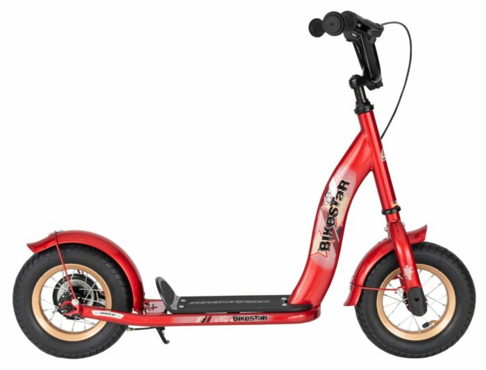 **Bikestar kwaliteit** Een step is fantastisch speelgoed voor een kind – en wanneer het model het toelaat ook voor volwassenen. Het vergroot de wereld, als je het steppen eenmaal onder de knie hebt kun je snel en met weinig inspanning hele afstanden afleggen. Je leert spelenderwijs je evenwicht houden, verkeerssituaties inschatten, omgaan met snelheid, sturen en afremmen. Daarvoor moet het stepje wel van goede kwaliteit zijn. Wees gerust, steps van Bikestar zijn oerdegelijk gebouwd en voldoen aan alle veiligheidseisen. Daarbij heeft Bikestar een assortiment van steps dat een grote variatie kent in wielmaten, kleuren en typen steps, zodat er altijd wel een is die precies voldoet aan uw of uw kinds wensen. **Dit model heeft de volgende kenmerken:** Zeer stabiel en multi-gecoat stalen buisframe met slagvaste kleur! Deze step voldoet aan alle normen en vereisten van de EU (DIN EN 71-1 / 2/3) en de VS (ASTM F2264-14 / CPSIA 101/108. . Absoluut kindvriendelijk! De step stuurt licht dankzij kogellagerbesturing, is duurzaam en gaat lang mee. De step is veilig, met schone lasnaden, geen scherpe hoeken of randen. De step heeft ook een kindvriendelijke handrem voor extra veiligheid tijdens het spelen. Langdurig plezier gegarandeerd, met 10 inch luchtbanden op hoogwaardige, kogelgelagerde spaakvelgen. **Specificaties** – 10 inch luchtbanden voor lekkere vering op solide velgen – Stabiel stalen frame met meerdere slagvaste laklagen – Spatborden op voor- en achterwiel: geen vieze kleding – Handrem op achterwiel met kindermaat handgrepen – In hoogte en hoek verstelbaar kogelgelagerd stuur – Gifvrije veiligheidshandgrepen en stuurpolstering – Antislip voetbord, zijstandaard en veiligheidsmoeren op de assen – Remleidingen veilig weggewerkt binnen het frame