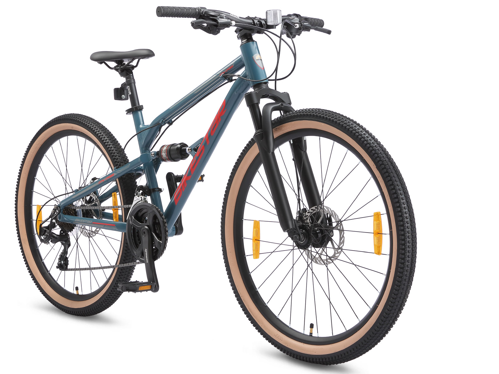 **Prima mountainbike** Zeer stabiel aluminium frame voor dagelijks gebruik op de berg, in de stad of op school. Met een bandenmaat van 26 inch en framemaat 16 inch is hij geschikt voor jongens, meisjes of volwassenen van ca. 150 tot 165cm. Met het 21-speed Shimano derailleur-systeem met bijna naadloze schakeling kun je elke situatie aan. Mechanische schijfremmen aan de voor- en achterkant zorgen voor de nodige controle. De fiets heeft een geveerde voorvork met 55 mm veerweg en een geveerde achterbrug. **Bikestar kwaliteit** Bikestar is gespecialiseerd in de productie van hoogwaardige fietsen die perfect op hun taak berekend zijn. Daarom worden alleen hoogwaardige componenten gebruikt, die bijdragen aan de veiligheid en duurzaamheid van de fiets. De fiets wordt 90%25 compleet gemonteerd afgeleverd. U dient zelf nog de pedalen, zadel en het voorwiel te monteren. U doet er goed aan de fiets voor het eerste gebruik door een fietsenmaker te laten controleren en de fiets om de zoveel maanden een onderhoudsbeurt te laten geven voor een lang en veilig gebruik. **Specificaties** – Vanaf ca 150 cm lengte (12 jaar) – Zadelhoogte: 75-96 cm – Stuurhoogte: 91-93 cm – Framehoogte: 16 inch / 41 cm – Versnellingen: 21 (Shimano derailleur) – Framemateriaal: 6061 aluminium – Geveerde voorvork met 55mm veerweg – Remmen: schijfremmen – Ketting: KMC – Banden: 26 x 2.10 – Gewicht: 18 kg – Max. toegestaan gewicht: 100 kg – 90%25 voorgemonteerd, circa 15 minuten montage vereist