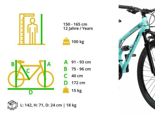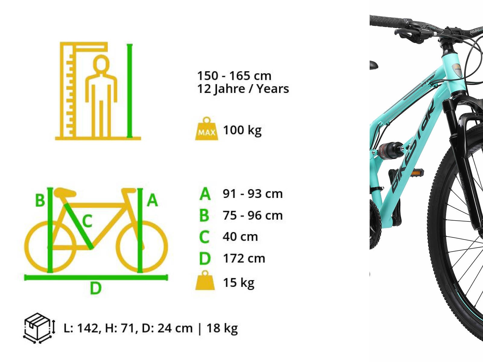 **Prima mountainbike** Zeer stabiel aluminium frame voor dagelijks gebruik op de berg, in de stad of op school. Met een bandenmaat van 26 inch en framemaat 16 inch is hij geschikt voor jongens, meisjes of volwassenen van ca. 150 tot 165cm. Met het 21-speed Shimano derailleur-systeem met bijna naadloze schakeling kun je elke situatie aan. Mechanische schijfremmen aan de voor- en achterkant zorgen voor de nodige controle. De fiets heeft een geveerde voorvork met 55 mm veerweg en een geveerde achterbrug. **Bikestar kwaliteit** Bikestar is gespecialiseerd in de productie van hoogwaardige fietsen die perfect op hun taak berekend zijn. Daarom worden alleen hoogwaardige componenten gebruikt, die bijdragen aan de veiligheid en duurzaamheid van de fiets. De fiets wordt 90%25 compleet gemonteerd afgeleverd. U dient zelf nog de pedalen, zadel en het voorwiel te monteren. U doet er goed aan de fiets voor het eerste gebruik door een fietsenmaker te laten controleren en de fiets om de zoveel maanden een onderhoudsbeurt te laten geven voor een lang en veilig gebruik. **Specificaties** – Vanaf ca 150 cm lengte (12 jaar) – Zadelhoogte: 75-96 cm – Stuurhoogte: 91-93 cm – Framehoogte: 16 inch / 41 cm – Versnellingen: 21 (Shimano derailleur) – Framemateriaal: 6061 aluminium – Geveerde voorvork met 55mm veerweg – Remmen: schijfremmen – Ketting: KMC – Banden: 26 x 2.10 – Gewicht: 18 kg – Max. toegestaan gewicht: 100 kg – 90%25 voorgemonteerd, circa 15 minuten montage vereist