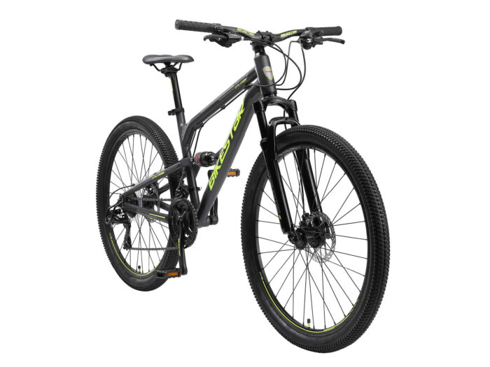 **Prima mountainbike** Zeer stabiel aluminium frame voor dagelijks gebruik op de berg, in de stad of op school. Met een bandenmaat van 26 inch en framemaat 16 inch is hij geschikt voor jongens, meisjes of volwassenen van ca. 150 tot 165cm. Met het 21-speed Shimano derailleur-systeem met bijna naadloze schakeling kun je elke situatie aan. Mechanische schijfremmen aan de voor- en achterkant zorgen voor de nodige controle. De fiets heeft een geveerde voorvork met 55 mm veerweg en een geveerde achterbrug. **Bikestar kwaliteit** Bikestar is gespecialiseerd in de productie van hoogwaardige fietsen die perfect op hun taak berekend zijn. Daarom worden alleen hoogwaardige componenten gebruikt, die bijdragen aan de veiligheid en duurzaamheid van de fiets. De fiets wordt 90%25 compleet gemonteerd afgeleverd. U dient zelf nog de pedalen, zadel en het voorwiel te monteren. U doet er goed aan de fiets voor het eerste gebruik door een fietsenmaker te laten controleren en de fiets om de zoveel maanden een onderhoudsbeurt te laten geven voor een lang en veilig gebruik. **Specificaties** – Vanaf ca 150 cm lengte (12 jaar) – Zadelhoogte: 75-96 cm – Stuurhoogte: 91-93 cm – Framehoogte: 16 inch / 41 cm – Versnellingen: 21 (Shimano derailleur) – Framemateriaal: 6061 aluminium – Geveerde voorvork met 55mm veerweg – Remmen: schijfremmen – Ketting: KMC – Banden: 26 x 2.10 – Gewicht: 18 kg – Max. toegestaan gewicht: 100 kg – 90%25 voorgemonteerd, circa 15 minuten montage vereist
