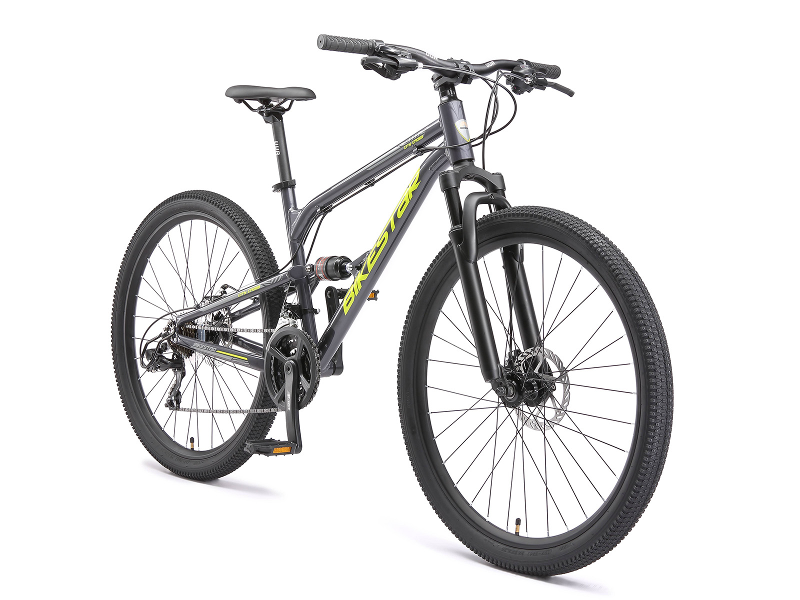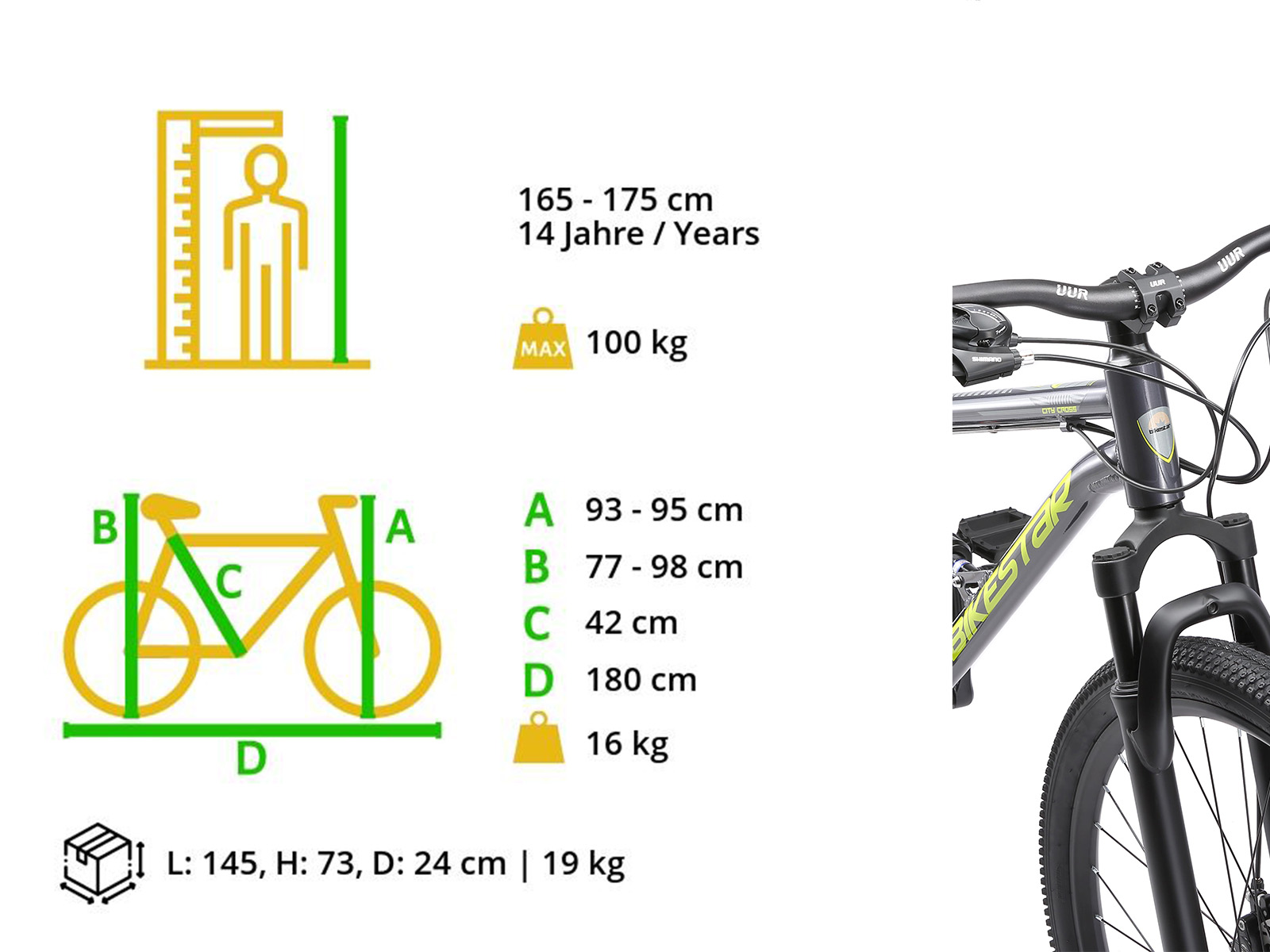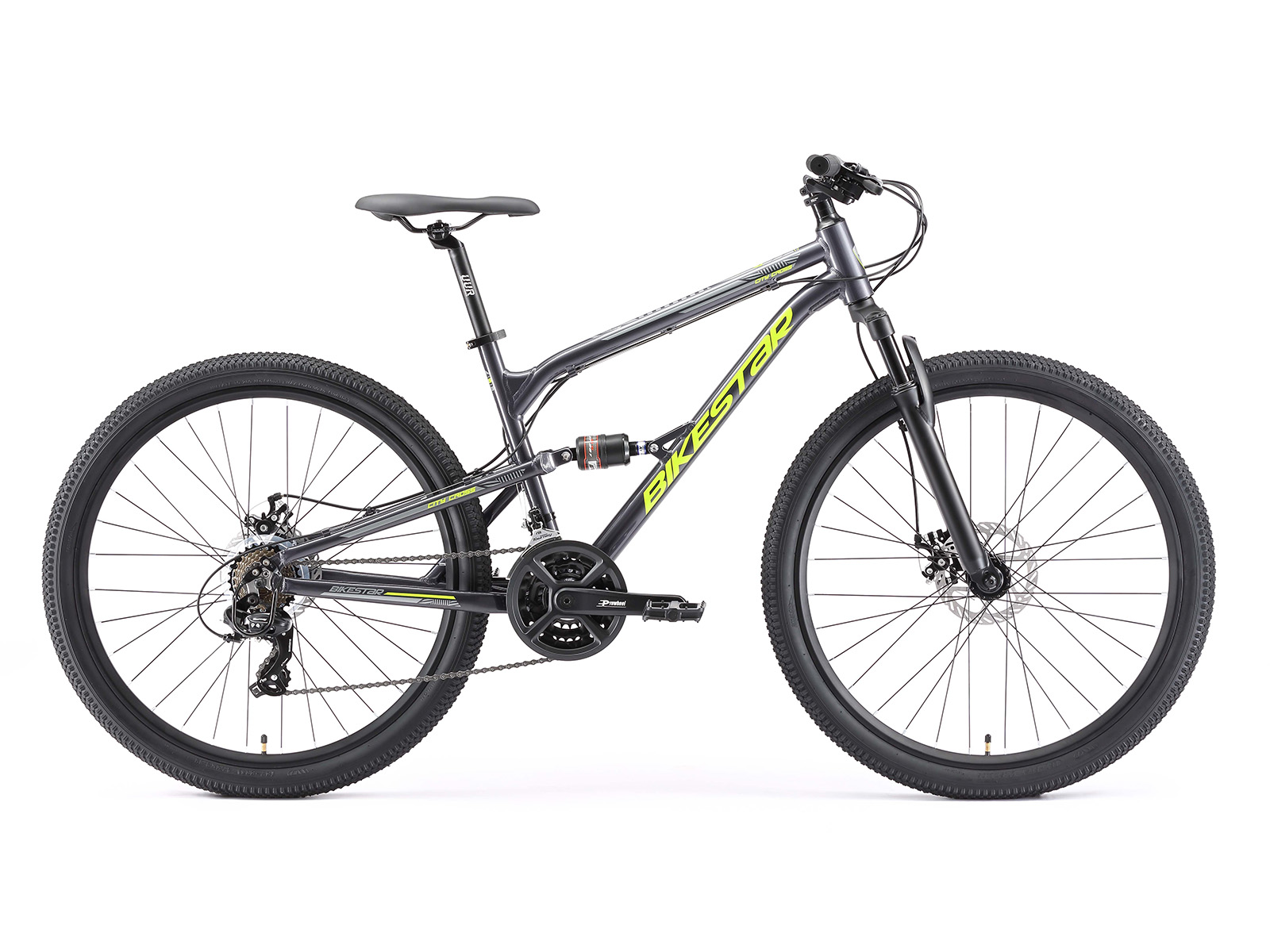 **Prima mountainbike** Zeer stabiel aluminium frame voor dagelijks gebruik op de berg, in de stad of op school. Met een bandenmaat van 27.5 inch en framemaat 16.5 inch is hij geschikt voor jongens, meisjes of volwassenen van ca. 165 tot 175cm. Met het 21-speed Shimano derailleur-systeem met bijna naadloze schakeling kun je elke situatie aan. Mechanische schijfremmen aan de voor- en achterkant zorgen voor de nodige controle. De fiets heeft een geveerde voorvork met 55 mm veerweg en een geveerde achterbrug. **Bikestar kwaliteit** Bikestar is gespecialiseerd in de productie van hoogwaardige fietsen die perfect op hun taak berekend zijn. Daarom worden alleen hoogwaardige componenten gebruikt, die bijdragen aan de veiligheid en duurzaamheid van de fiets. De fiets wordt 90%25 compleet gemonteerd afgeleverd. U dient zelf nog de pedalen, zadel en het voorwiel te monteren. U doet er goed aan de fiets voor het eerste gebruik door een fietsenmaker te laten controleren en de fiets om de zoveel maanden een onderhoudsbeurt te laten geven voor een lang en veilig gebruik. **Specificaties** – Vanaf ca 165 cm lengte (14 jaar) – Zadelhoogte: 77 – 98 cm – Stuurhoogte: 93-95 cm – Framehoogte: 16,5 inch / 42 cm – Versnellingen: 21 (Shimano derailleur) – Framemateriaal: 6061 aluminium – Geveerde voorvork met 55mm veerweg – Remmen: schijfremmen – Ketting: KMC – Banden: 27.5 x 2.10 – Gewicht: 19 kg – Max. toegestaan gewicht: 100 kg – 90%25 voorgemonteerd, circa 15 minuten montage vereist