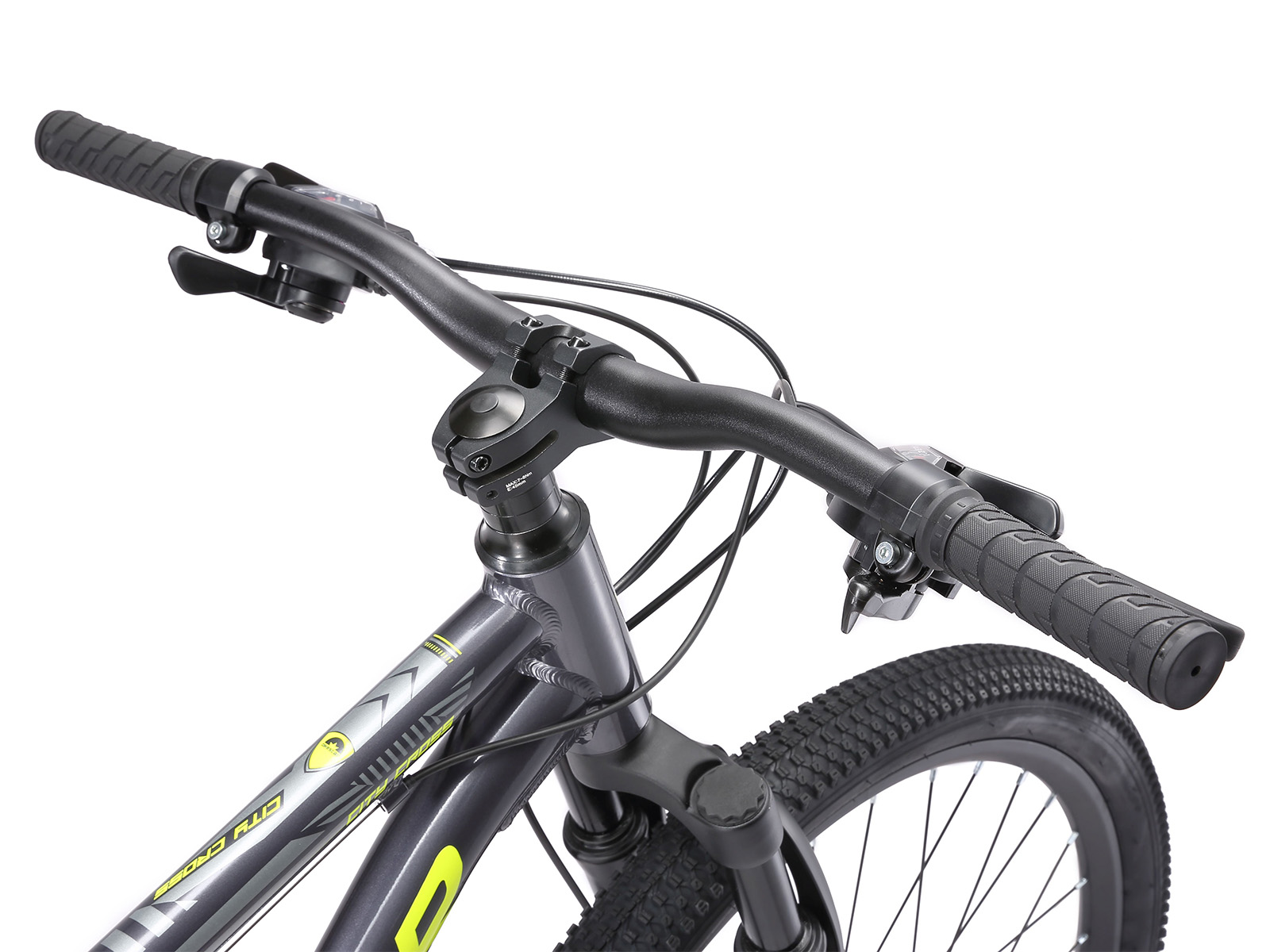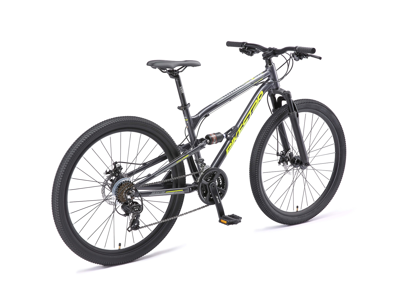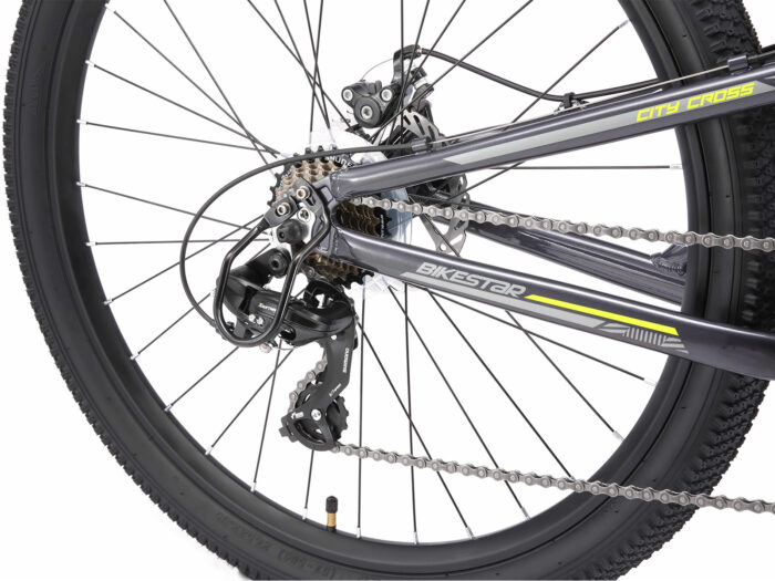 **Prima mountainbike** Zeer stabiel aluminium frame voor dagelijks gebruik op de berg, in de stad of op school. Met een bandenmaat van 27.5 inch en framemaat 16.5 inch is hij geschikt voor jongens, meisjes of volwassenen van ca. 165 tot 175cm. Met het 21-speed Shimano derailleur-systeem met bijna naadloze schakeling kun je elke situatie aan. Mechanische schijfremmen aan de voor- en achterkant zorgen voor de nodige controle. De fiets heeft een geveerde voorvork met 55 mm veerweg en een geveerde achterbrug. **Bikestar kwaliteit** Bikestar is gespecialiseerd in de productie van hoogwaardige fietsen die perfect op hun taak berekend zijn. Daarom worden alleen hoogwaardige componenten gebruikt, die bijdragen aan de veiligheid en duurzaamheid van de fiets. De fiets wordt 90%25 compleet gemonteerd afgeleverd. U dient zelf nog de pedalen, zadel en het voorwiel te monteren. U doet er goed aan de fiets voor het eerste gebruik door een fietsenmaker te laten controleren en de fiets om de zoveel maanden een onderhoudsbeurt te laten geven voor een lang en veilig gebruik. **Specificaties** – Vanaf ca 165 cm lengte (14 jaar) – Zadelhoogte: 77 – 98 cm – Stuurhoogte: 93-95 cm – Framehoogte: 16,5 inch / 42 cm – Versnellingen: 21 (Shimano derailleur) – Framemateriaal: 6061 aluminium – Geveerde voorvork met 55mm veerweg – Remmen: schijfremmen – Ketting: KMC – Banden: 27.5 x 2.10 – Gewicht: 19 kg – Max. toegestaan gewicht: 100 kg – 90%25 voorgemonteerd, circa 15 minuten montage vereist