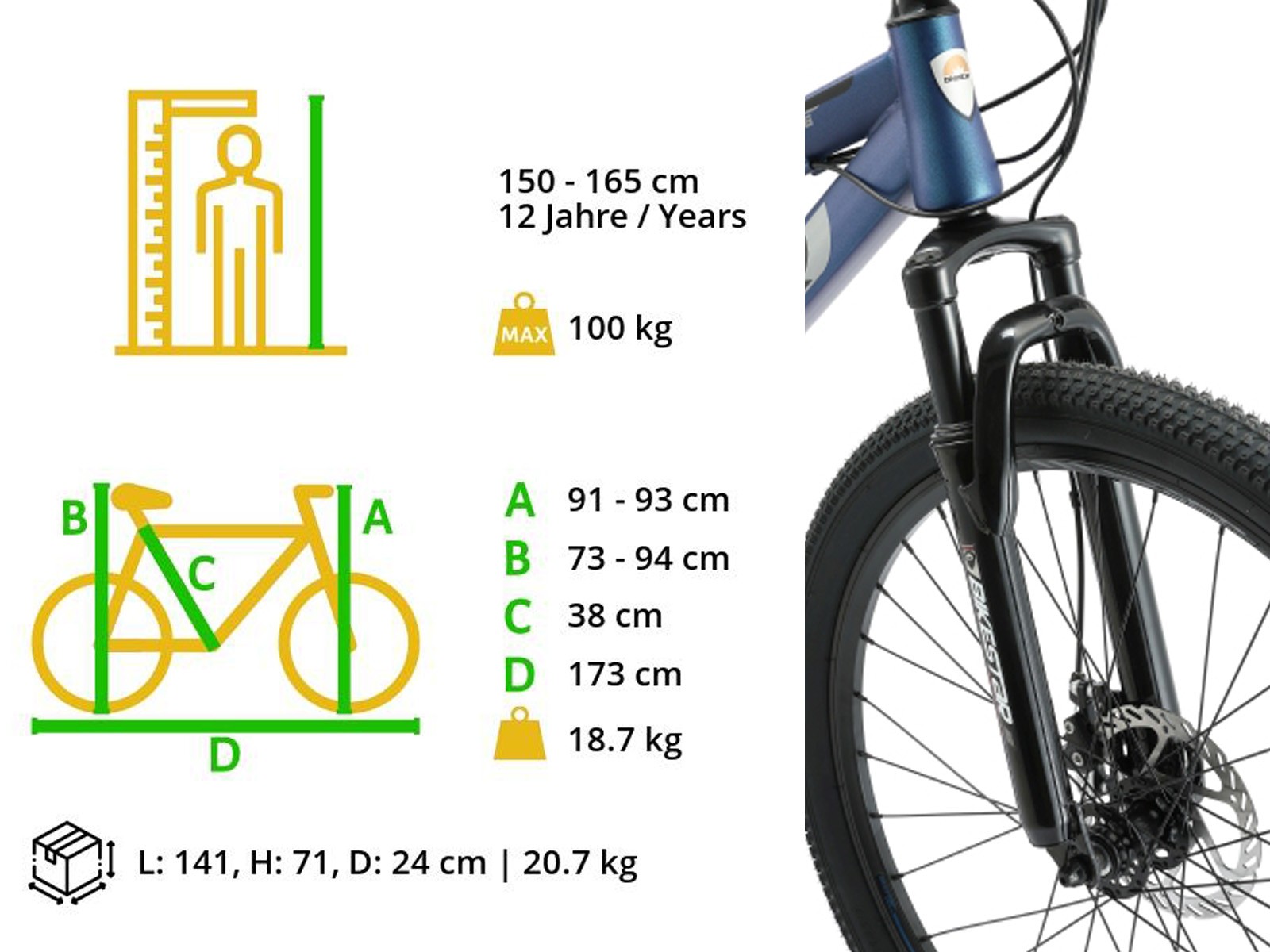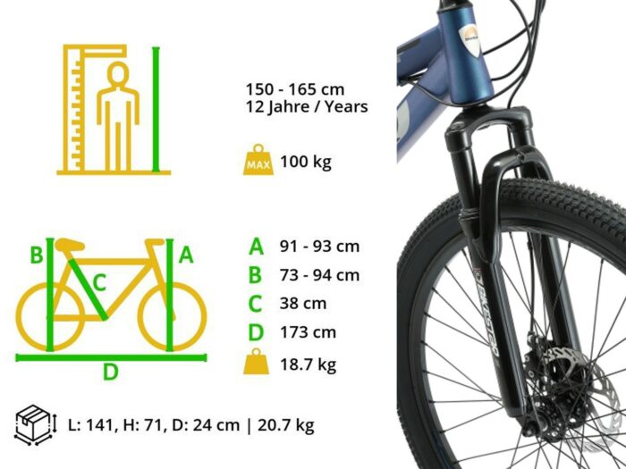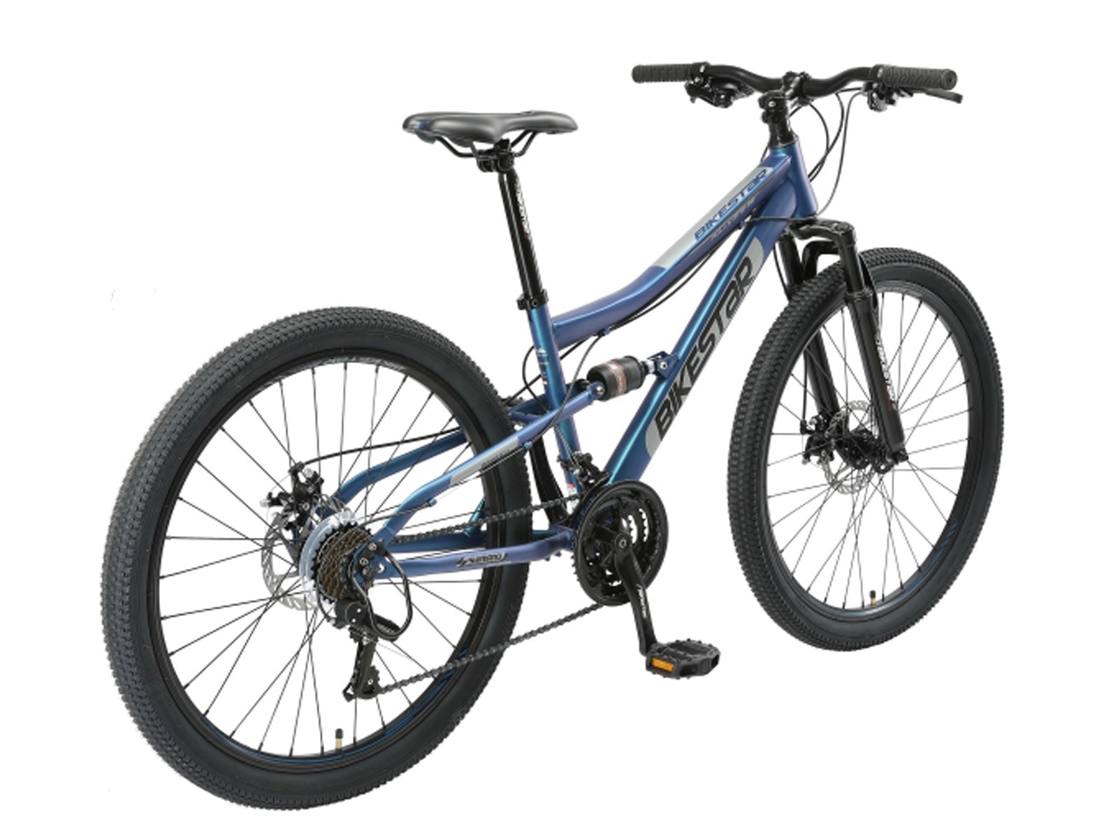 **Fully mountainbike** Zeer stabiel stalen frame voor dagelijks gebruik op de berg, in de stad of op school. Met een bandenmaat van 26 inch en framemaat 15 inch is hij geschikt voor jongens, meisjes of volwassenen van ca. 150 tot 165cm. Met het 21-speed Shimano derailleur-systeem met bijna naadloze schakeling kun je elke situatie aan. Mechanische schijfremmen aan de voor- en achterkant zorgen voor de nodige controle. De fiets heeft een geveerde voorvork met 55 mm veerweg en een geveerde achterbrug. **Bikestar kwaliteit** Bikestar is gespecialiseerd in de productie van hoogwaardige fietsen die perfect op hun taak berekend zijn. Daarom worden alleen hoogwaardige componenten gebruikt, die bijdragen aan de veiligheid en duurzaamheid van de fiets. De fiets wordt 90%25 compleet gemonteerd afgeleverd. U dient zelf nog de pedalen, zadel en het voorwiel te monteren. U doet er goed aan de fiets voor het eerste gebruik door een fietsenmaker te laten controleren en de fiets om de zoveel maanden een onderhoudsbeurt te laten geven voor een lang en veilig gebruik. **Specificaties** – Vanaf ca 150 cm lengte (12 jaar) – Zadelhoogte: 75 – 98 cm – Stuurhoogte: 91-93 cm – Framehoogte: 15 inch / 38 cm – Versnellingen: 21 (Shimano derailleur) – Framemateriaal: staal – Geveerde voorvork met 55mm veerweg – Geveerde achterbrug – Remmen: schijfremmen – Banden: 26 x 2.10 – Gewicht: 19 kg – Max. toegestaan gewicht: 100 kg – 90%25 voorgemonteerd, circa 15 minuten montage vereist