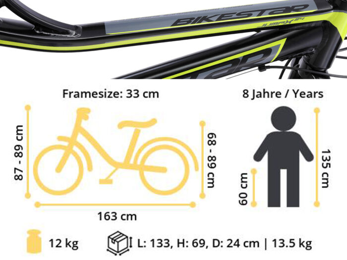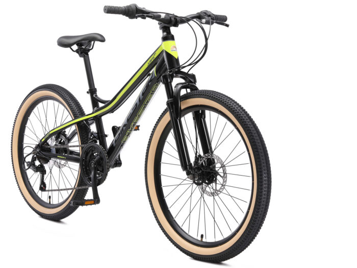 ** Prima mountainbike ** Zeer stabiel aluminium frame voor dagelijks gebruik op de berg, in de stad of op school. Met een bandenmaat van 24 inch en framemaat 13 inch is hij geschikt voor jongens of meisjes, vanaf ca. 140cm. Met het 21-speed Shimano derailleur-systeem met bijna naadloze schakeling kun je elke situatie aan. De bijzonder gripvaste schijfremmen aan de voor- en achterkant zorgen voor de nodige controle. De fiets heeft een geveerde voorvork met 55 mm veerweg. ** Bikestar kwaliteit ** Bikestar is gespecialiseerd in de productie van hoogwaardige fietsen die perfect op hun taak berekend zijn. Daarom worden alleen hoogwaardige componenten gebruikt, die bijdragen aan de veiligheid en duurzaamheid van de fiets. De fiets wordt 90%25 compleet gemonteerd afgeleverd. U dient zelf nog de pedalen, zadel en het voorwiel te monteren. U doet er goed aan de fiets voor het eerste gebruik door een fietsenmaker te laten controleren en de fiets om de zoveel maanden een onderhoudsbeurt te laten geven voor een lang en veilig gebruik. Bikestar staat al tien jaar voor een productontwerp dat de harten van kinderen inspireert. Met zijn merken BIKESTAR, STAR-SCOOTER en STAR-SKATEBOARDS heeft het bedrijf een reusachtig assortiment kindervoertuigen beschikbaar. De firma overtuigt door snelle levering en permanente beschikbaarheid van reserveonderdelen. ** Specificaties ** – Leeftijd: 10-13 jaar (vanaf 140cm lengte) – Zadelhoogte: ca. 67-77 cm – Stuurhoogte: ca. 87-89 cm – Gewicht: 12 Kg – Wielmaat 24 inch – Framehoogte: 13 inch (33 cm) – Versnellingen: 21 (Shimano) – Framemateriaal: 6061 aluminium – Geveerde voorvork met 55 mm veerweg – Derailleur: Shimano Tourney RD-TY300 – Schakelaar: Shimano draaigreep – Cassette: Shimano MF-TZ500 – Remmen: schijfremmen – Ketting: Shimano TZ-21 – Max. toegestaan gewicht: 65 Kg – 90%25 voorgemonteerd