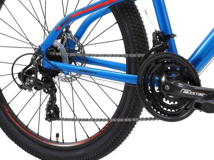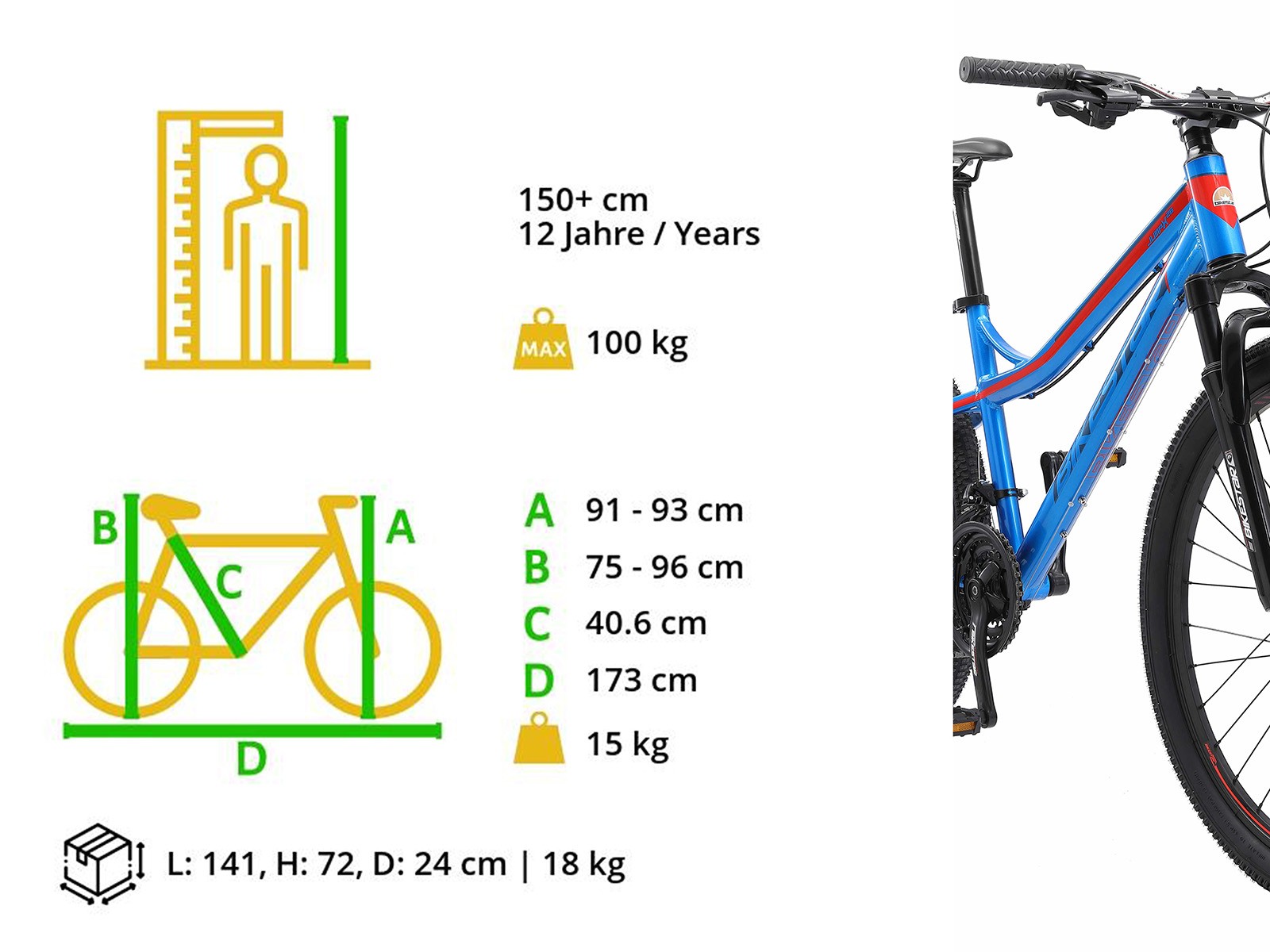 **Prima mountainbike** Zeer stabiel aluminium frame voor dagelijks gebruik op de berg, in de stad of op school. Met een bandenmaat van 26 inch en framemaat 16 inch is hij geschikt voor jongens, meisjes of volwassenen van ca. 150 tot 165cm. Met het 21-speed Shimano derailleur-systeem met bijna naadloze schakeling kun je elke situatie aan. Mechanische schijfremmen aan de voor- en achterkant zorgen voor de nodige controle. De fiets heeft een geveerde voorvork met 55 mm veerweg. **Bikestar kwaliteit** Bikestar is gespecialiseerd in de productie van hoogwaardige fietsen die perfect op hun taak berekend zijn. Daarom worden alleen hoogwaardige componenten gebruikt, die bijdragen aan de veiligheid en duurzaamheid van de fiets. De fiets wordt 90%25 compleet gemonteerd afgeleverd. U dient zelf nog de pedalen, zadel en het voorwiel te monteren. U doet er goed aan de fiets voor het eerste gebruik door een fietsenmaker te laten controleren en de fiets om de zoveel maanden een onderhoudsbeurt te laten geven voor een lang en veilig gebruik. **Specificaties** – Vanaf ca 150 cm lengte (12 jaar) – Zadelhoogte: 75-96 cm – Stuurhoogte: 91-93 cm – Framehoogte: 16 inch / 41 cm – Versnellingen: 21 (Shimano derailleur) – Framemateriaal: 6061 aluminium – Geveerde voorvork met 55mm veerweg – Remmen: schijfremmen – Ketting: KMC – Banden: 26 x 2.10 – Gewicht: 15 kg – Max. toegestaan gewicht: 100 kg – 90%25 voorgemonteerd, circa 15 minuten montage vereist