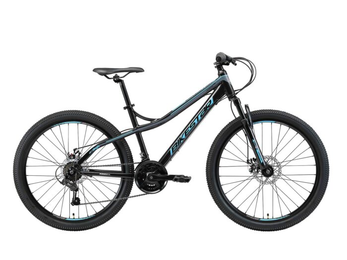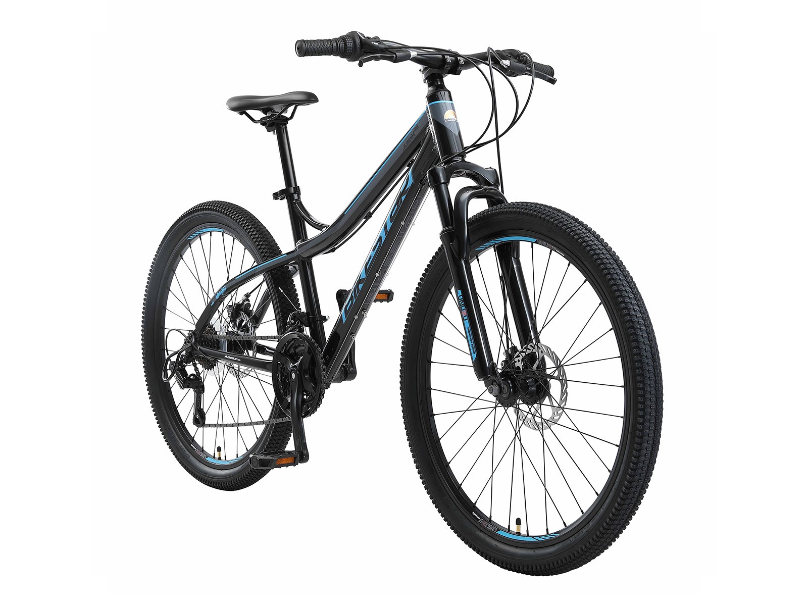 **Prima mountainbike** Zeer stabiel aluminium frame voor dagelijks gebruik op de berg, in de stad of op school. Met een bandenmaat van 26 inch en framemaat 16 inch is hij geschikt voor jongens, meisjes of volwassenen van ca. 150 tot 165cm. Met het 21-speed Shimano derailleur-systeem met bijna naadloze schakeling kun je elke situatie aan. Mechanische schijfremmen aan de voor- en achterkant zorgen voor de nodige controle. De fiets heeft een geveerde voorvork met 55 mm veerweg. **Bikestar kwaliteit** Bikestar is gespecialiseerd in de productie van hoogwaardige fietsen die perfect op hun taak berekend zijn. Daarom worden alleen hoogwaardige componenten gebruikt, die bijdragen aan de veiligheid en duurzaamheid van de fiets. De fiets wordt 90%25 compleet gemonteerd afgeleverd. U dient zelf nog de pedalen, zadel en het voorwiel te monteren. U doet er goed aan de fiets voor het eerste gebruik door een fietsenmaker te laten controleren en de fiets om de zoveel maanden een onderhoudsbeurt te laten geven voor een lang en veilig gebruik. **Specificaties** – Vanaf ca 150 cm lengte (12 jaar) – Zadelhoogte: 75-96 cm – Stuurhoogte: 91-93 cm – Framehoogte: 16 inch / 41 cm – Versnellingen: 21 (Shimano derailleur) – Framemateriaal: 6061 aluminium – Geveerde voorvork met 55mm veerweg – Remmen: schijfremmen – Ketting: KMC – Banden: 26 x 2.10 – Gewicht: 15 kg – Max. toegestaan gewicht: 100 kg – 90%25 voorgemonteerd, circa 15 minuten montage vereist