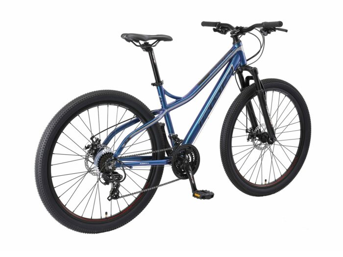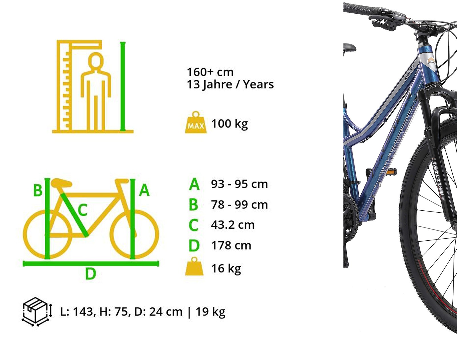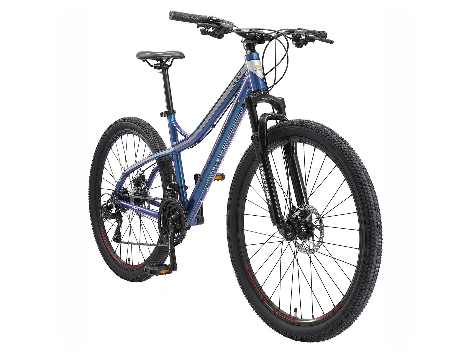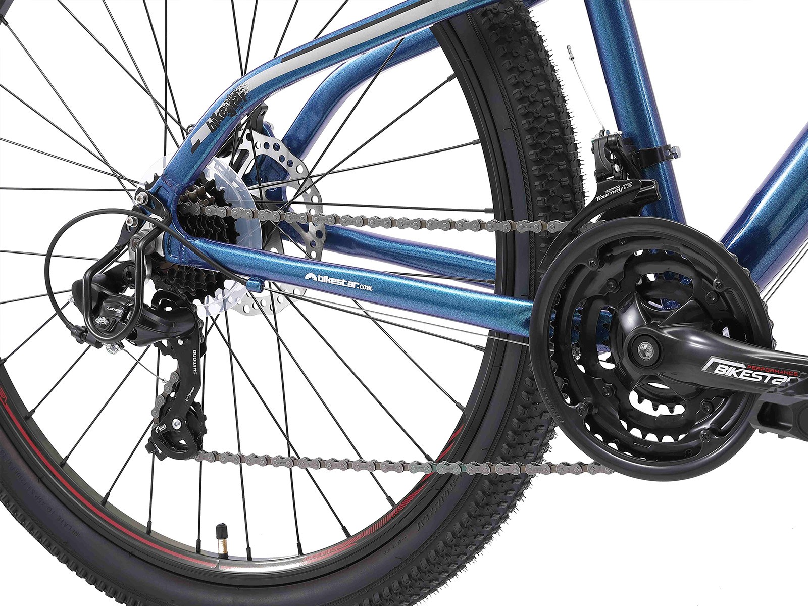**Prima mountainbike** Zeer stabiel aluminium frame voor dagelijks gebruik op de berg, in de stad of op school. Met een bandenmaat van 27,5 inch en framemaat 17 inch is hij geschikt voor jongens, meisjes of volwassenen van ca. 165 tot 175cm. Met het 21-speed Shimano derailleur-systeem met bijna naadloze schakeling kun je elke situatie aan. Mechanische schijfremmen aan de voor- en achterkant zorgen voor de nodige controle. De fiets heeft een geveerde voorvork met 55 mm veerweg. **Bikestar kwaliteit** Bikestar is gespecialiseerd in de productie van hoogwaardige fietsen die perfect op hun taak berekend zijn. Daarom worden alleen hoogwaardige componenten gebruikt, die bijdragen aan de veiligheid en duurzaamheid van de fiets. De fiets wordt 90%25 compleet gemonteerd afgeleverd. U dient zelf nog de pedalen, zadel en het voorwiel te monteren. U doet er goed aan de fiets voor het eerste gebruik door een fietsenmaker te laten controleren en de fiets om de zoveel maanden een onderhoudsbeurt te laten geven voor een lang en veilig gebruik. **Specificaties** – Vanaf ca 165 cm lengte (14 jaar) – Zadelhoogte: 78-99 cm – Stuurhoogte: 93-95 cm – Framehoogte: 17 inch / 42 cm – Versnellingen: 21 (Shimano derailleur) – Framemateriaal: 6061 aluminium – Geveerde voorvork met 55mm veerweg – Remmen: schijfremmen – Banden: 27.5 x 2.10 – Gewicht: 16 kg – Max. toegestaan gewicht: 100 kg – 90%25 voorgemonteerd, circa 15 minuten montage vereist
