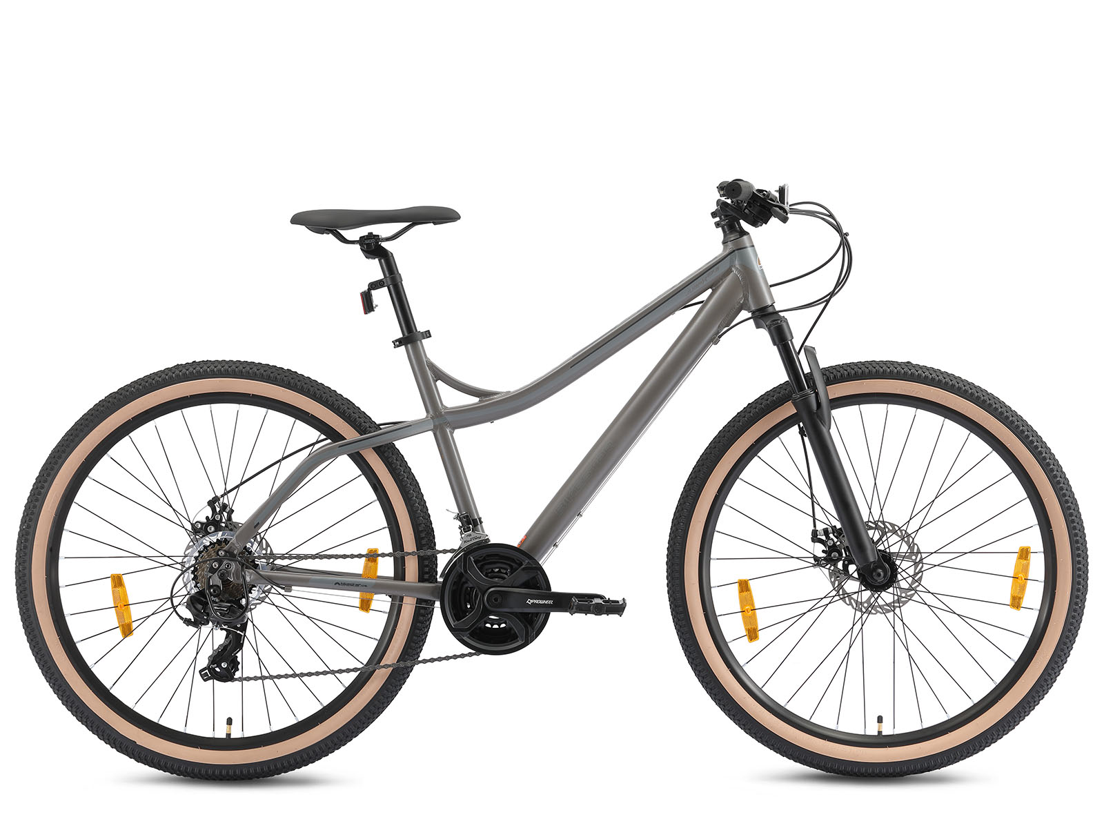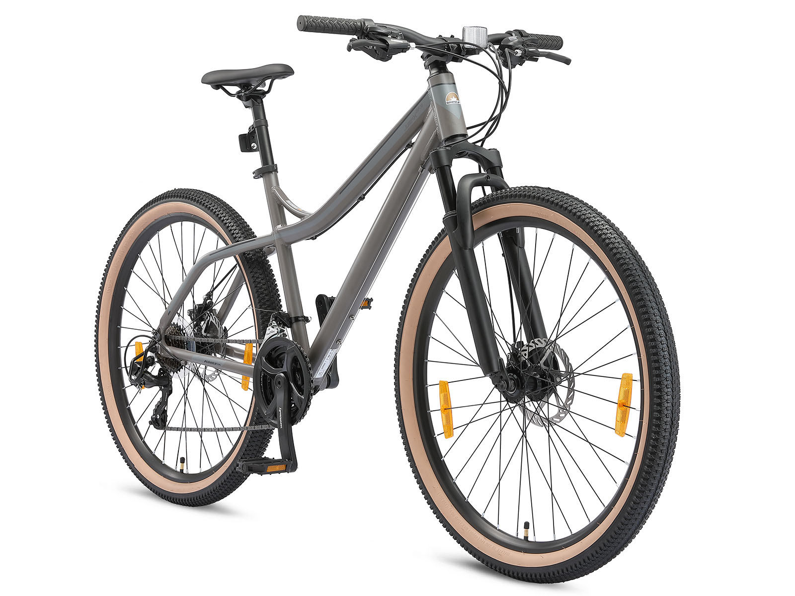 **Prima mountainbike** Zeer stabiel aluminium frame voor dagelijks gebruik op de berg, in de stad of op school. Met een bandenmaat van 27,5 inch en framemaat 17 inch is hij geschikt voor jongens, meisjes of volwassenen van ca. 165 tot 175cm. Met het 21-speed Shimano derailleur-systeem met bijna naadloze schakeling kun je elke situatie aan. Mechanische schijfremmen aan de voor- en achterkant zorgen voor de nodige controle. De fiets heeft een geveerde voorvork met 55 mm veerweg. **Bikestar kwaliteit** Bikestar is gespecialiseerd in de productie van hoogwaardige fietsen die perfect op hun taak berekend zijn. Daarom worden alleen hoogwaardige componenten gebruikt, die bijdragen aan de veiligheid en duurzaamheid van de fiets. De fiets wordt 90%25 compleet gemonteerd afgeleverd. U dient zelf nog de pedalen, zadel en het voorwiel te monteren. U doet er goed aan de fiets voor het eerste gebruik door een fietsenmaker te laten controleren en de fiets om de zoveel maanden een onderhoudsbeurt te laten geven voor een lang en veilig gebruik. **Specificaties** – Vanaf ca 165 cm lengte (14 jaar) – Zadelhoogte: 78-99 cm – Stuurhoogte: 93-95 cm – Framehoogte: 17 inch / 42 cm – Versnellingen: 21 (Shimano derailleur) – Framemateriaal: 6061 aluminium – Geveerde voorvork met 55mm veerweg – Remmen: schijfremmen – Banden: 27.5 x 2.10 – Gewicht: 16 kg – Max. toegestaan gewicht: 100 kg – 90%25 voorgemonteerd, circa 15 minuten montage vereist