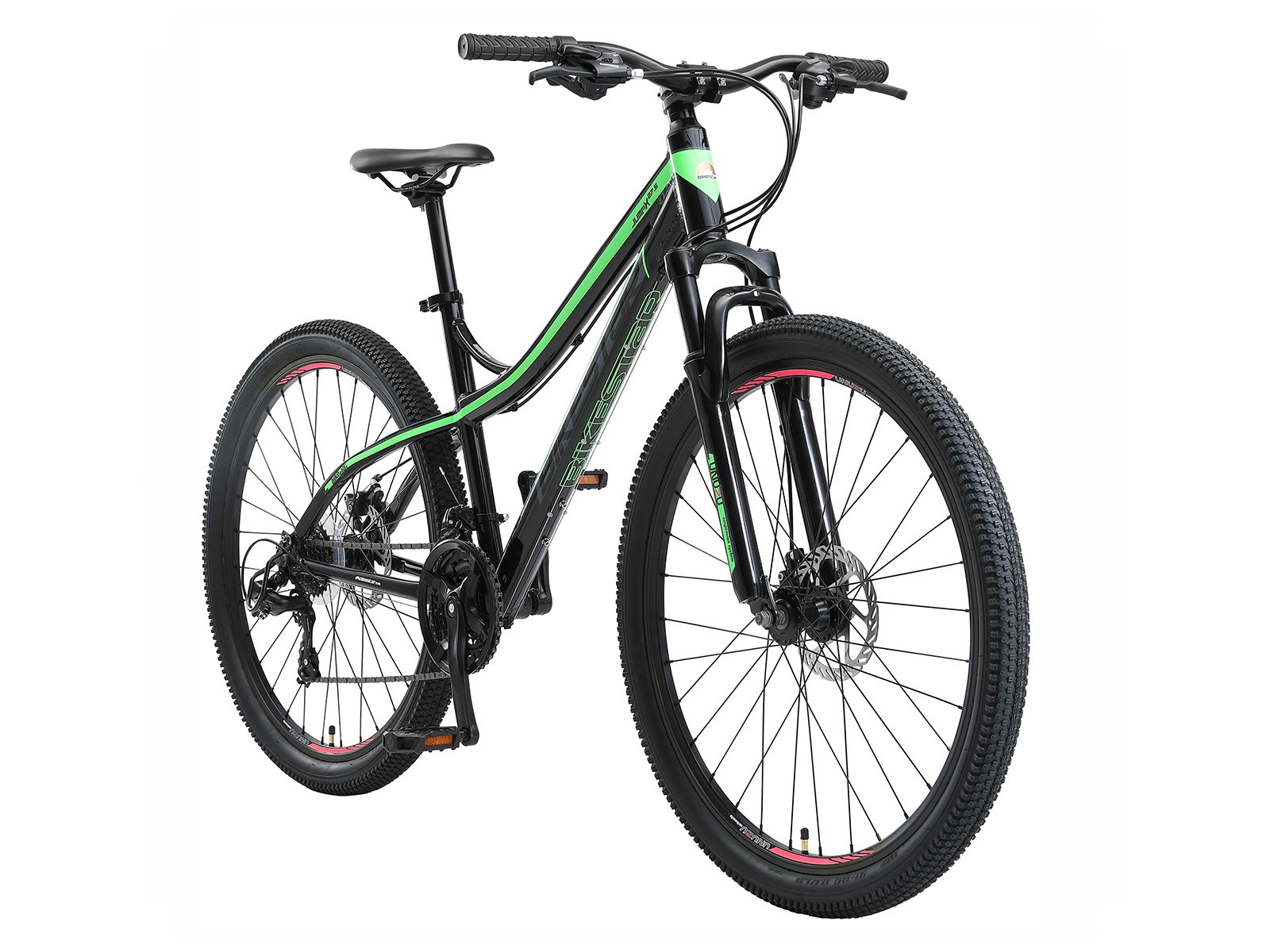**Prima mountainbike** Zeer stabiel aluminium frame voor dagelijks gebruik op de berg, in de stad of op school. Met een bandenmaat van 27,5 inch en framemaat 17 inch is hij geschikt voor jongens, meisjes of volwassenen van ca. 165 tot 175cm. Met het 21-speed Shimano derailleur-systeem met bijna naadloze schakeling kun je elke situatie aan. Mechanische schijfremmen aan de voor- en achterkant zorgen voor de nodige controle. De fiets heeft een geveerde voorvork met 55 mm veerweg. **Bikestar kwaliteit** Bikestar is gespecialiseerd in de productie van hoogwaardige fietsen die perfect op hun taak berekend zijn. Daarom worden alleen hoogwaardige componenten gebruikt, die bijdragen aan de veiligheid en duurzaamheid van de fiets. De fiets wordt 90%25 compleet gemonteerd afgeleverd. U dient zelf nog de pedalen, zadel en het voorwiel te monteren. U doet er goed aan de fiets voor het eerste gebruik door een fietsenmaker te laten controleren en de fiets om de zoveel maanden een onderhoudsbeurt te laten geven voor een lang en veilig gebruik. **Specificaties** – Vanaf ca 165 cm lengte (14 jaar) – Zadelhoogte: 78-99 cm – Stuurhoogte: 93-95 cm – Framehoogte: 17 inch / 42 cm – Versnellingen: 21 (Shimano derailleur) – Framemateriaal: 6061 aluminium – Geveerde voorvork met 55mm veerweg – Remmen: schijfremmen – Banden: 27.5 x 2.10 – Gewicht: 16 kg – Max. toegestaan gewicht: 100 kg – 90%25 voorgemonteerd, circa 15 minuten montage vereist