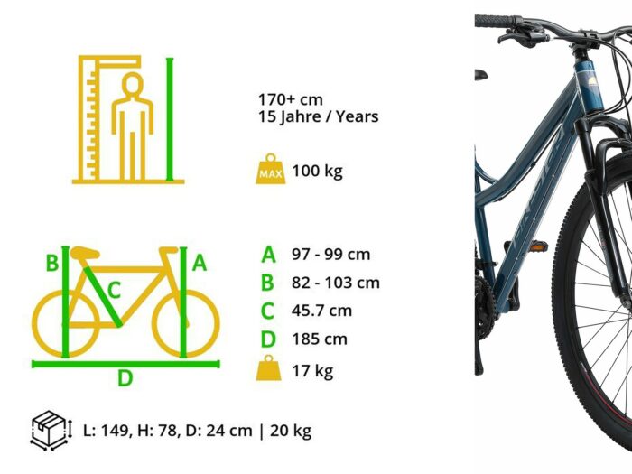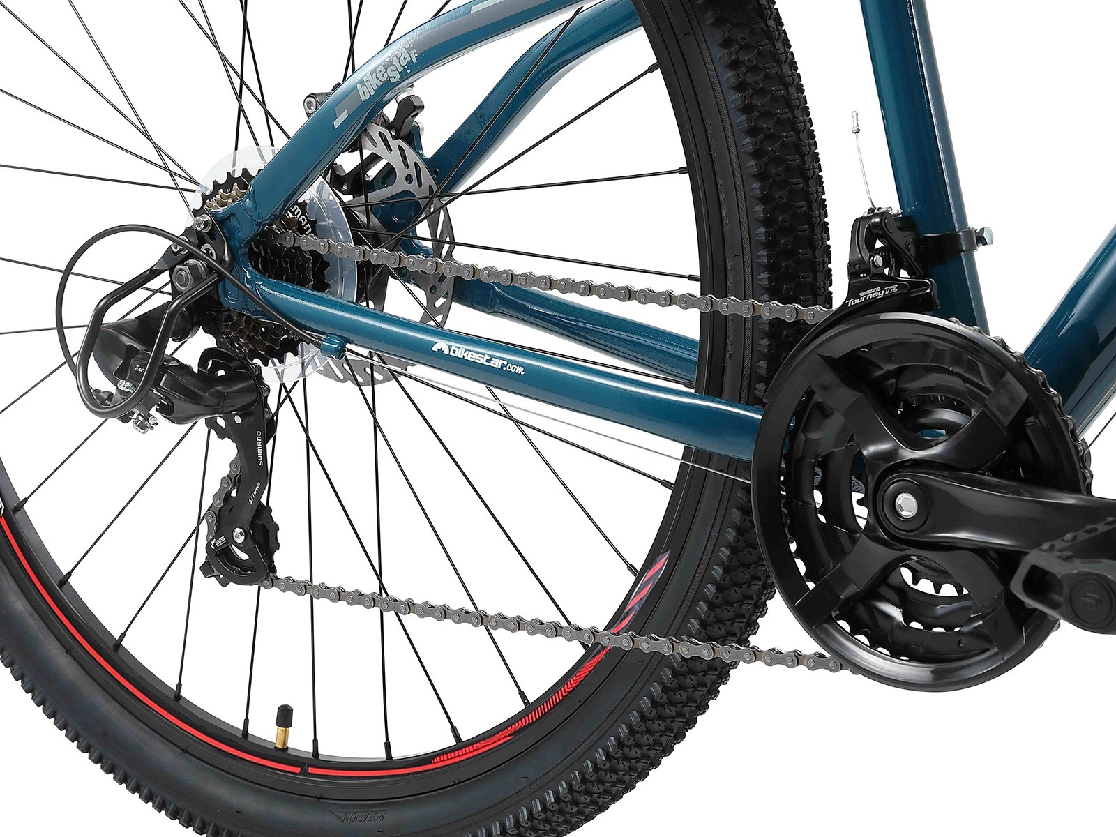 **Prima mountainbike** Zeer stabiel aluminium frame voor dagelijks gebruik op de berg, in de stad of op school. Met een bandenmaat van 29 inch en framemaat 18 inch is hij geschikt voor jongens, meisjes of volwassenen vanaf ca. 170cm. Met het 21-speed Shimano derailleur-systeem met bijna naadloze schakeling kun je elke situatie aan. Mechanische schijfremmen aan de voor- en achterkant zorgen voor de nodige controle. De fiets heeft een geveerde voorvork met 55 mm veerweg. **Bikestar kwaliteit** Bikestar is gespecialiseerd in de productie van hoogwaardige fietsen die perfect op hun taak berekend zijn. Daarom worden alleen hoogwaardige componenten gebruikt, die bijdragen aan de veiligheid en duurzaamheid van de fiets. De fiets wordt 90%25 compleet gemonteerd afgeleverd. U dient zelf nog de pedalen, zadel en het voorwiel te monteren. U doet er goed aan de fiets voor het eerste gebruik door een fietsenmaker te laten controleren en de fiets om de zoveel maanden een onderhoudsbeurt te laten geven voor een lang en veilig gebruik. **Specificaties** – Vanaf ca 170 cm lengte (15 jaar) – Zadelhoogte: 82-103 cm – Stuurhoogte: 97-99 cm – Framehoogte: 18 inch / 46 cm – Versnellingen: 21 (Shimano derailleur) – Framemateriaal: 6061 aluminium – Geveerde voorvork met 55mm veerweg – Remmen: schijfremmen – Banden: 29 x 2.10 – Gewicht: 17 kg – Max. toegestaan gewicht: 100 kg – 90%25 voorgemonteerd, circa 15 minuten montage vereist