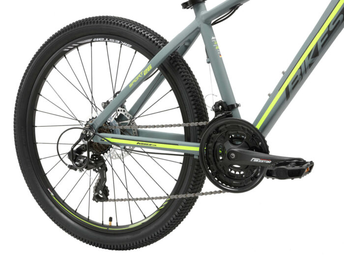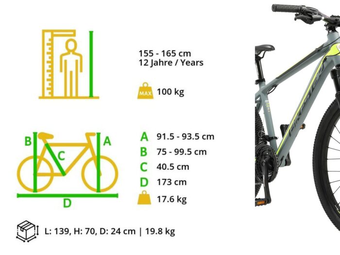 **Prima mountainbike** Zeer stabiel aluminium frame voor dagelijks gebruik op de berg, in de stad of op school. Met een bandenmaat van 26 inch en framemaat 16 inch is hij geschikt voor jongens, meisjes of volwassenen van ca. 155 tot 165cm. Met het 21-speed Shimano derailleur-systeem met bijna naadloze schakeling kun je elke situatie aan. Mechanische schijfremmen aan de voor- en achterkant zorgen voor de nodige controle. De fiets heeft een geveerde voorvork met 90 mm veerweg. **Bikestar kwaliteit** Bikestar is gespecialiseerd in de productie van hoogwaardige fietsen die perfect op hun taak berekend zijn. Daarom worden alleen hoogwaardige componenten gebruikt, die bijdragen aan de veiligheid en duurzaamheid van de fiets. De fiets wordt 90%25 compleet gemonteerd afgeleverd. U dient zelf nog de pedalen, zadel en het voorwiel te monteren. U doet er goed aan de fiets voor het eerste gebruik door een fietsenmaker te laten controleren en de fiets om de zoveel maanden een onderhoudsbeurt te laten geven voor een lang en veilig gebruik. **Specificaties** – Vanaf ca 155cm lengte (12 jaar) – Zadelhoogte: 75-99 cm – Stuurhoogte: 91-93 cm – Framehoogte: 16 inch / 41 cm – Versnellingen: 21 (Shimano derailleur) – Framemateriaal: 6061 aluminium – Geveerde voorvork met 90mm veerweg – Remmen: schijfremmen – Ketting: KMC – Banden: 26 x 2.10 – Gewicht: 18 kg – Max. toegestaan gewicht: 100 kg – 90%25 voorgemonteerd, circa 15 minuten montage vereist