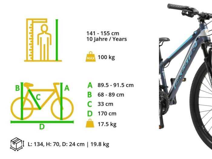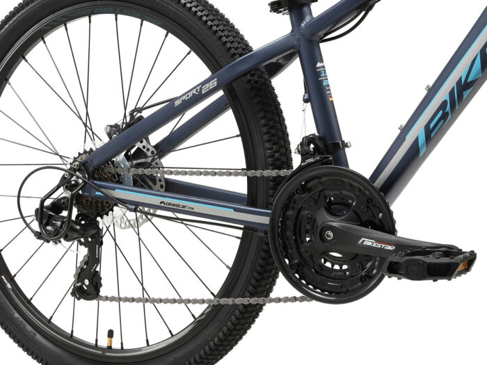**Prima mountainbike** Zeer stabiel aluminium frame voor dagelijks gebruik op de berg, in de stad of op school. Met een bandenmaat van 26 inch en framemaat 13 inch is hij geschikt voor jongens en meisjes van ca. 141 tot 155cm. Met het 21-speed Shimano derailleur-systeem met bijna naadloze schakeling kun je elke situatie aan. Mechanische schijfremmen aan de voor- en achterkant zorgen voor de nodige controle. De fiets heeft een geveerde voorvork met 90 mm veerweg. **Bikestar kwaliteit** Bikestar is gespecialiseerd in de productie van hoogwaardige fietsen die perfect op hun taak berekend zijn. Daarom worden alleen hoogwaardige componenten gebruikt, die bijdragen aan de veiligheid en duurzaamheid van de fiets. De fiets wordt 90%25 compleet gemonteerd afgeleverd. U dient zelf nog de pedalen, zadel en het voorwiel te monteren. U doet er goed aan de fiets voor het eerste gebruik door een fietsenmaker te laten controleren en de fiets om de zoveel maanden een onderhoudsbeurt te laten geven voor een lang en veilig gebruik. **Specificaties** – Vanaf ca 141cm lengte (10 jaar) – Zadelhoogte: 68-89 cm – Stuurhoogte: 90-92 cm – Framehoogte: 13 inch / 33 cm – Versnellingen: 21 (Shimano derailleur) – Framemateriaal: 6061 aluminium – Geveerde voorvork met 90mm veerweg – Remmen: schijfremmen – Ketting: KMC – Banden: 26 x 2.10 – Gewicht: 17,5 kg – Max. toegestaan gewicht: 100 kg – 90%25 voorgemonteerd, circa 15 minuten montage vereist