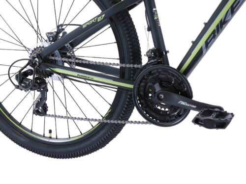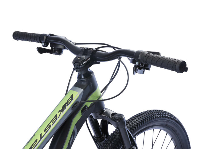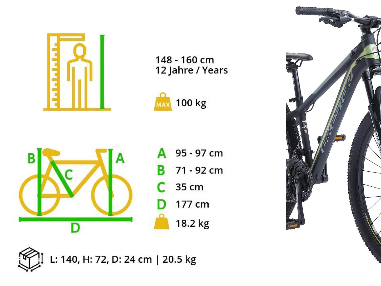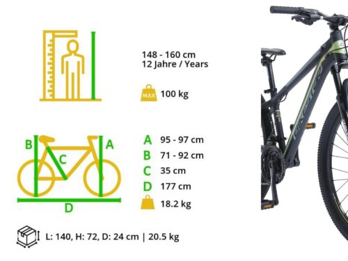 **Prima mountainbike** Zeer stabiel aluminium frame voor dagelijks gebruik op de berg, in de stad of op school. Met een bandenmaat van 27,5 inch en framemaat 14 inch is hij geschikt voor jongens en meisjes van ca. 148 tot 160cm. Met het 21-speed Shimano derailleur-systeem met bijna naadloze schakeling kun je elke situatie aan. Mechanische schijfremmen aan de voor- en achterkant zorgen voor de nodige controle. De fiets heeft een geveerde voorvork met 90 mm veerweg. **Bikestar kwaliteit** Bikestar is gespecialiseerd in de productie van hoogwaardige fietsen die perfect op hun taak berekend zijn. Daarom worden alleen hoogwaardige componenten gebruikt, die bijdragen aan de veiligheid en duurzaamheid van de fiets. De fiets wordt 90%25 compleet gemonteerd afgeleverd. U dient zelf nog de pedalen, zadel en het voorwiel te monteren. U doet er goed aan de fiets voor het eerste gebruik door een fietsenmaker te laten controleren en de fiets om de zoveel maanden een onderhoudsbeurt te laten geven voor een lang en veilig gebruik. **Specificaties** – Vanaf ca 148cm lengte (12 jaar) – Zadelhoogte: 71-92 cm – Stuurhoogte: 95-97 cm – Framehoogte: 14 inch / 35 cm – Versnellingen: 21 (Shimano derailleur) – Framemateriaal: 6061 aluminium – Geveerde voorvork met 90mm veerweg – Remmen: schijfremmen – Ketting: KMC – Banden: 27,5 x 2.10 – Gewicht: 18 kg – Max. toegestaan gewicht: 100 kg – 90%25 voorgemonteerd, circa 15 minuten montage vereist