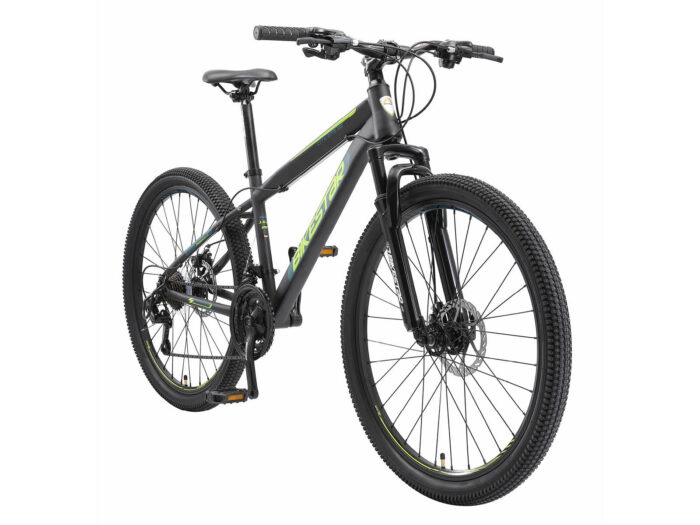 **Prima mountainbike** Zeer stabiel stalen frame voor dagelijks gebruik op de berg, in de stad of op school. Met een bandenmaat van 26 inch en framemaat 15 inch is hij geschikt voor jongens, meisjes of volwassenen van ca. 150 cm. Met het 21-speed Shimano derailleur-systeem met bijna naadloze schakeling kun je elke situatie aan. Mechanische schijfremmen aan de voor- en achterkant zorgen voor de nodige controle. De fiets heeft een geveerde voorvork met 55 mm veerweg. **Bikestar kwaliteit** Bikestar is gespecialiseerd in de productie van hoogwaardige fietsen die perfect op hun taak berekend zijn. Daarom worden alleen hoogwaardige componenten gebruikt, die bijdragen aan de veiligheid en duurzaamheid van de fiets. De fiets wordt 90%25 compleet gemonteerd afgeleverd. U dient zelf nog de pedalen, zadel en het voorwiel te monteren. U doet er goed aan de fiets voor het eerste gebruik door een fietsenmaker te laten controleren en de fiets om de zoveel maanden een onderhoudsbeurt te laten geven voor een lang en veilig gebruik. **Specificaties** – Vanaf ca 150 cm lengte (12 jaar) – Zadelhoogte: 75-95 cm – Stuurhoogte: 96-98 cm – Framehoogte: 15 inch / 38 cm – Versnellingen: 21 (Shimano derailleur) – Framemateriaal: staal – Geveerde voorvork met 55mm veerweg – Remmen: schijfremmen – Banden: 26 x 2.10 – Gewicht: 17 kg – Max. toegestaan gewicht: 100 kg – 90%25 voorgemonteerd, circa 15 minuten montage vereist