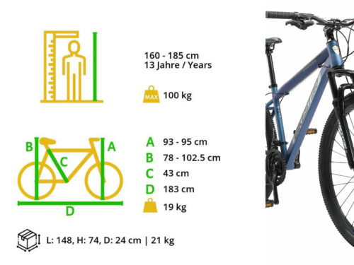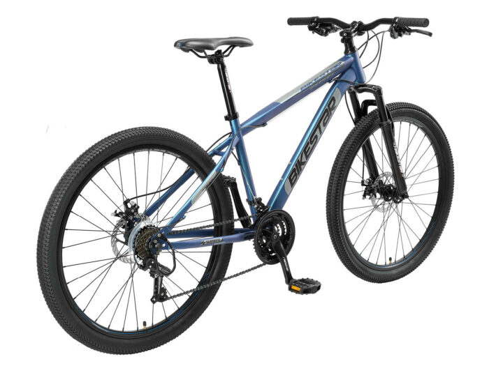**Prima mountainbike** Zeer stabiel stalen frame voor dagelijks gebruik op de berg, in de stad of op school. Met een bandenmaat van 27,5 inch en framemaat 17 inch is hij geschikt voor jongens, meisjes of volwassenen van ca. 165 cm. Met het 21-speed Shimano derailleur-systeem met bijna naadloze schakeling kun je elke situatie aan. Mechanische schijfremmen aan de voor- en achterkant zorgen voor de nodige controle. De fiets heeft een geveerde voorvork met 55 mm veerweg. **Bikestar kwaliteit** Bikestar is gespecialiseerd in de productie van hoogwaardige fietsen die perfect op hun taak berekend zijn. Daarom worden alleen hoogwaardige componenten gebruikt, die bijdragen aan de veiligheid en duurzaamheid van de fiets. De fiets wordt 90%25 compleet gemonteerd afgeleverd. U dient zelf nog de pedalen, zadel en het voorwiel te monteren. U doet er goed aan de fiets voor het eerste gebruik door een fietsenmaker te laten controleren en de fiets om de zoveel maanden een onderhoudsbeurt te laten geven voor een lang en veilig gebruik. **Specificaties** – Vanaf ca 165 cm lengte (14 jaar) – Zadelhoogte: 78-99 cm – Stuurhoogte: 93-95 cm – Framehoogte: 17 inch / 43 cm – Versnellingen: 21 (Shimano derailleur) – Framemateriaal: staal – Geveerde voorvork met 55mm veerweg – Remmen: schijfremmen – Banden: 27,5 x 2.10 – Gewicht: 19 kg – Max. toegestaan gewicht: 100 kg – 90%25 voorgemonteerd, circa 15 minuten montage vereist