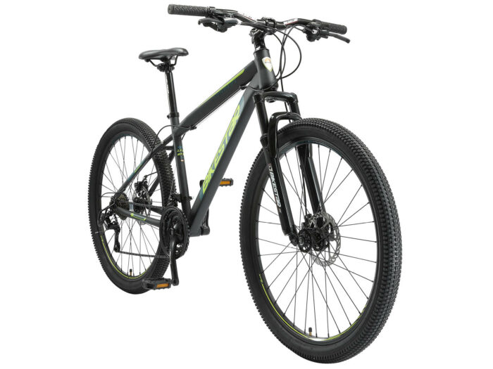 **Prima mountainbike** Zeer stabiel stalen frame voor dagelijks gebruik op de berg, in de stad of op school. Met een bandenmaat van 27,5 inch en framemaat 17 inch is hij geschikt voor jongens, meisjes of volwassenen van ca. 165 cm. Met het 21-speed Shimano derailleur-systeem met bijna naadloze schakeling kun je elke situatie aan. Mechanische schijfremmen aan de voor- en achterkant zorgen voor de nodige controle. De fiets heeft een geveerde voorvork met 55 mm veerweg. **Bikestar kwaliteit** Bikestar is gespecialiseerd in de productie van hoogwaardige fietsen die perfect op hun taak berekend zijn. Daarom worden alleen hoogwaardige componenten gebruikt, die bijdragen aan de veiligheid en duurzaamheid van de fiets. De fiets wordt 90%25 compleet gemonteerd afgeleverd. U dient zelf nog de pedalen, zadel en het voorwiel te monteren. U doet er goed aan de fiets voor het eerste gebruik door een fietsenmaker te laten controleren en de fiets om de zoveel maanden een onderhoudsbeurt te laten geven voor een lang en veilig gebruik. **Specificaties** – Vanaf ca 165 cm lengte (14 jaar) – Zadelhoogte: 78-99 cm – Stuurhoogte: 93-95 cm – Framehoogte: 17 inch / 43 cm – Versnellingen: 21 (Shimano derailleur) – Framemateriaal: staal – Geveerde voorvork met 55mm veerweg – Remmen: schijfremmen – Banden: 27,5 x 2.10 – Gewicht: 19 kg – Max. toegestaan gewicht: 100 kg – 90%25 voorgemonteerd, circa 15 minuten montage vereist