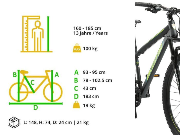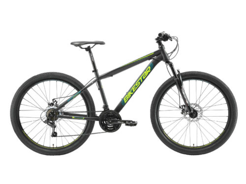 **Prima mountainbike** Zeer stabiel stalen frame voor dagelijks gebruik op de berg, in de stad of op school. Met een bandenmaat van 27,5 inch en framemaat 17 inch is hij geschikt voor jongens, meisjes of volwassenen van ca. 165 cm. Met het 21-speed Shimano derailleur-systeem met bijna naadloze schakeling kun je elke situatie aan. Mechanische schijfremmen aan de voor- en achterkant zorgen voor de nodige controle. De fiets heeft een geveerde voorvork met 55 mm veerweg. **Bikestar kwaliteit** Bikestar is gespecialiseerd in de productie van hoogwaardige fietsen die perfect op hun taak berekend zijn. Daarom worden alleen hoogwaardige componenten gebruikt, die bijdragen aan de veiligheid en duurzaamheid van de fiets. De fiets wordt 90%25 compleet gemonteerd afgeleverd. U dient zelf nog de pedalen, zadel en het voorwiel te monteren. U doet er goed aan de fiets voor het eerste gebruik door een fietsenmaker te laten controleren en de fiets om de zoveel maanden een onderhoudsbeurt te laten geven voor een lang en veilig gebruik. **Specificaties** – Vanaf ca 165 cm lengte (14 jaar) – Zadelhoogte: 78-99 cm – Stuurhoogte: 93-95 cm – Framehoogte: 17 inch / 43 cm – Versnellingen: 21 (Shimano derailleur) – Framemateriaal: staal – Geveerde voorvork met 55mm veerweg – Remmen: schijfremmen – Banden: 27,5 x 2.10 – Gewicht: 19 kg – Max. toegestaan gewicht: 100 kg – 90%25 voorgemonteerd, circa 15 minuten montage vereist
