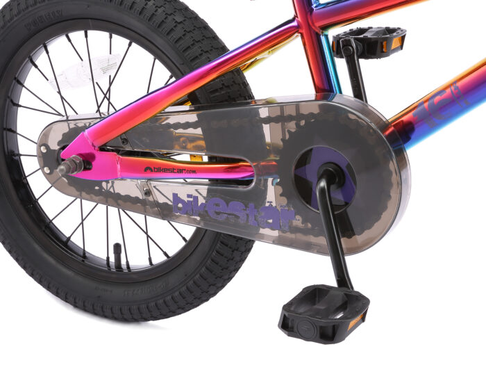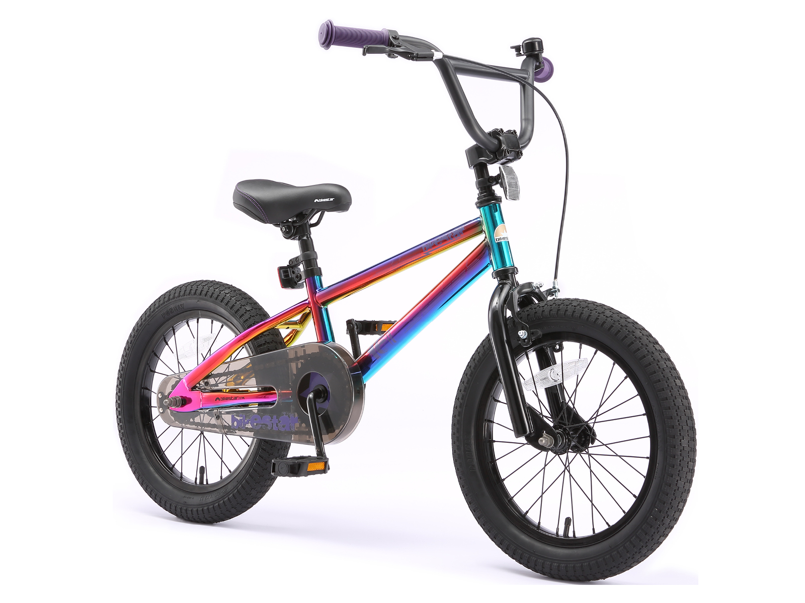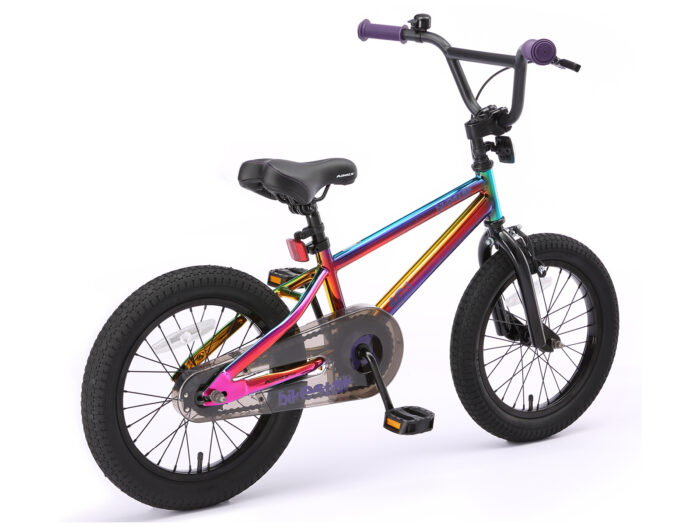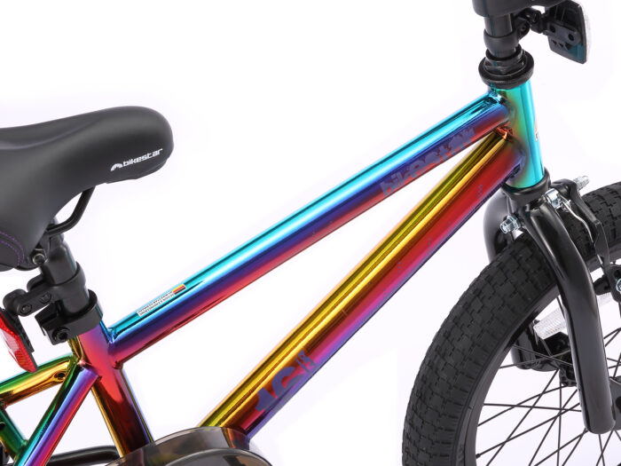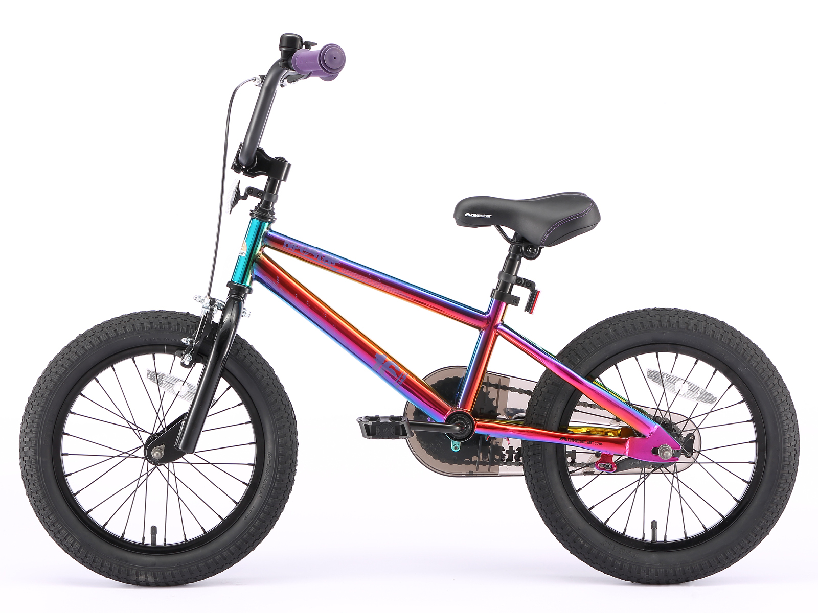 ** Vakmanschap ** Dankzij aluminium onderdelen is onze fiets bijzonder licht en dankzij de precieze afwerking ook extreem stabiel. Uiteraard voldoet de fiets aan de wettelijke normen en met een nauwkeurige eindcontrole garanderen wij een allround veilige en stabiele kinderfiets. ** Jong geleerd ** Deze fiets is geschikt voor kinderen vanaf 4 jaar en een lengte van 110cm. Door het in hoogte en helling verstelbare stuur en zadel kunnen kinderen lang fietsen – ook na een groeispurt. De ergonomie tussen zadel en stuur is zodanig dat kinderen altijd de juiste houding op de fiets aannemen, wat een gezonde ontwikkeling bevorderd. ** Specificaties ** – Leeftijd: vanaf ca. 4-5 jaar (110cm lengte) – Zadelhoogte: ca. 53-63 cm – Stuurhoogte: ca. 80-87 cm – Gewicht: 9,5 Kg – Stevig stalen frame met slagvaste laklaag – Stuur met kogellagers, in hoogte en hellingshoek instelbaar – Ergonomisch gevormd kinderzadel, in hoogte en hellingshoek instelbaar – Met terugtraprem – Gecertificeerde, gifvrije veiligheidshandgrepen – Voorwielrem met op kinderhandjes aangepaste, instelbare greep – Volledig gesloten kettingkast en trapas met kogellagers – Reflectoren aan voor- en achterzijde en aan de pedalen – 40.6cm (16 inch) Luchtbanden op hoogwaardige aluminium velgen – 95%25 voorgemonteerd, in circa 15 minuten af te monteren