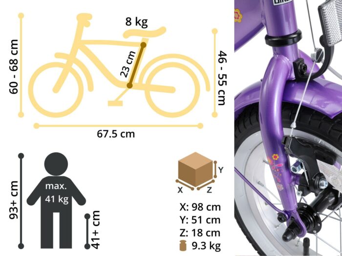 **Vakmanschap** Dankzij aluminium onderdelen is onze fiets bijzonder licht en dankzij de precieze afwerking ook extreem stabiel. Uiteraard voldoet de fiets aan de wettelijke normen en met een nauwkeurige eindcontrole garanderen wij een allround veilige en stabiele kinderfiets **Jong geleerd** Deze fiets is geschikt voor kinderen vanaf 3 jaar en een lengte van 93cm. Door het in hoogte en helling verstelbare stuur en zadel kunnen kinderen lang fietsen – ook na een groeispurt. De ergonomie tussen zadel en stuur is zodanig dat kinderen altijd de juiste houding op de fiets aannemen, wat een gezonde ontwikkeling bevorderd. **Specificaties** – Leeftijd: vanaf ca. 3 jaar (95cm lengte) – Zadelhoogte: ca. 47-55 cm – Stuurhoogte: ca. 60-68 cm – Gewicht: 7,9 Kg – Stevig stalen frame met slagvaste laklaag – Stuur met kogellagers, in hoogte en hellingshoek instelbaar – Ergonomisch gevormd kinderzadel, in hoogte en hellingshoek instelbaar – Met terugtraprem – Gecertificeerde, gifvrije veiligheidshandgrepen – Voorwielrem met op kinderhandjes aangepaste, instelbare greep – Volledig gesloten kettingkast en trapas met kogellagers – Reflectoren aan voor- en achterzijde en aan de pedalen – 30.5cm (12 inch) Luchtbanden op hoogwaardige aluminium velgen – 95%25 voorgemonteerd, in circa 15 minuten af te monteren