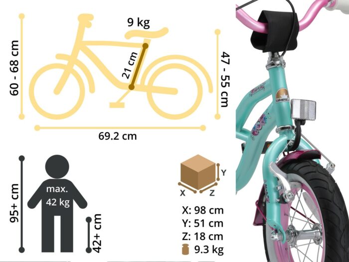 **Vakmanschap** Dankzij aluminium onderdelen is onze fiets bijzonder licht en dankzij de precieze afwerking ook extreem stabiel. Uiteraard voldoet de fiets aan de wettelijke normen en met een nauwkeurige eindcontrole garanderen wij een allround veilige en stabiele kinderfiets **Jong geleerd** Deze fiets is geschikt voor kinderen vanaf 3 jaar en een lengte van 93cm. Door het in hoogte en helling verstelbare stuur en zadel kunnen kinderen lang fietsen – ook na een groeispurt. De ergonomie tussen zadel en stuur is zodanig dat kinderen altijd de juiste houding op de fiets aannemen, wat een gezonde ontwikkeling bevorderd. **Specificaties** – Leeftijd: vanaf ca. 3 jaar (95cm lengte) – Zadelhoogte: ca. 47-55 cm – Stuurhoogte: ca. 60-68 cm – Gewicht: 9 Kg – Stevig stalen frame met slagvaste laklaag – Stuur met kogellagers, in hoogte en hellingshoek instelbaar – Ergonomisch gevormd kinderzadel, in hoogte en hellingshoek instelbaar – Met terugtraprem – Gecertificeerde, gifvrije veiligheidshandgrepen – Voorwielrem met op kinderhandjes aangepaste, instelbare greep – Volledig gesloten kettingkast en trapas met kogellagers – Reflectoren aan voor- en achterzijde en aan de pedalen – 30.5cm (12 inch) Luchtbanden op hoogwaardige aluminium velgen – 95%25 voorgemonteerd, in circa 15 minuten af te monteren