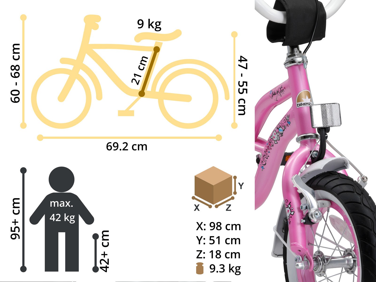 **Vakmanschap** Dankzij aluminium onderdelen is onze fiets bijzonder licht en dankzij de precieze afwerking ook extreem stabiel. Uiteraard voldoet de fiets aan de wettelijke normen en met een nauwkeurige eindcontrole garanderen wij een allround veilige en stabiele kinderfiets **Jong geleerd** Deze fiets is geschikt voor kinderen vanaf 3 jaar en een lengte van 93cm. Door het in hoogte en helling verstelbare stuur en zadel kunnen kinderen lang fietsen – ook na een groeispurt. De ergonomie tussen zadel en stuur is zodanig dat kinderen altijd de juiste houding op de fiets aannemen, wat een gezonde ontwikkeling bevorderd. **Specificaties** – Leeftijd: vanaf ca. 3 jaar (95cm lengte) – Zadelhoogte: ca. 47-55 cm – Stuurhoogte: ca. 60-68 cm – Gewicht: 9 Kg – Stevig stalen frame met slagvaste laklaag – Stuur met kogellagers, in hoogte en hellingshoek instelbaar – Ergonomisch gevormd kinderzadel, in hoogte en hellingshoek instelbaar – Met terugtraprem – Gecertificeerde, gifvrije veiligheidshandgrepen – Voorwielrem met op kinderhandjes aangepaste, instelbare greep – Volledig gesloten kettingkast en trapas met kogellagers – Reflectoren aan voor- en achterzijde en aan de pedalen – 30.5cm (12 inch) Luchtbanden op hoogwaardige aluminium velgen – 95%25 voorgemonteerd, in circa 15 minuten af te monteren