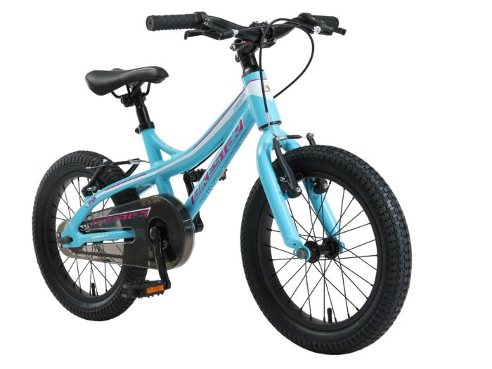 ** Vakmanschap ** Dankzij aluminium onderdelen is onze fiets bijzonder licht en dankzij de precieze afwerking ook extreem stabiel. Uiteraard voldoet de fiets aan de wettelijke normen en met een nauwkeurige eindcontrole garanderen wij een allround veilige en stabiele kinderfiets. Superlichte mountainbike met 1 versnelling, velgremmen en kettingkast ** Jong geleerd ** Deze fiets is geschikt voor kinderen vanaf 4 jaar en een lengte van 110cm. Door het in hoogte en helling verstelbare stuur en zadel kunnen kinderen lang fietsen – ook na een groeispurt. De ergonomie tussen zadel en stuur is zodanig dat kinderen altijd de juiste houding op de fiets aannemen, wat een gezonde ontwikkeling bevorderd. ** Specificaties ** – Leeftijd: vanaf ca. 4-5 jaar (110cm lengte) – Zadelhoogte: ca. 53-65 cm – Stuurhoogte: ca. 72-74 cm – Gewicht: 11 Kg – Licht maar stabiel aluminium frame met lage instap – Water- en stofdichte trapsas met vierkante CrMo as – Premium Design crank zoals op de duurste fietsen – 40.6 cm (16 inch) Luchtbanden op hoogwaardige aluminium velgen – Slagvaste meerlaagse lak – Makkelijk sturen met in hoogte en hellingshoek instelbaar stuur – Ergonomisch in hoogte en hellingshoek instelbaar zadel – V-brakes voor en achter met op kinderhanden aangepaste remgrepen