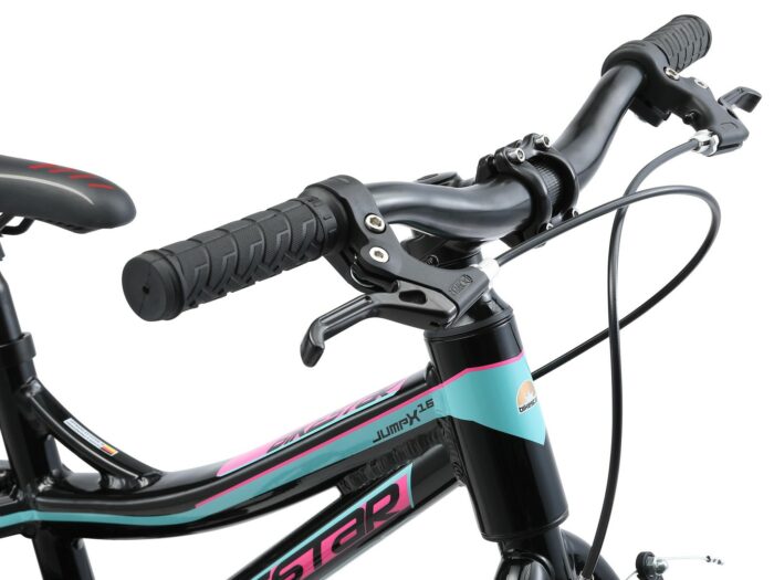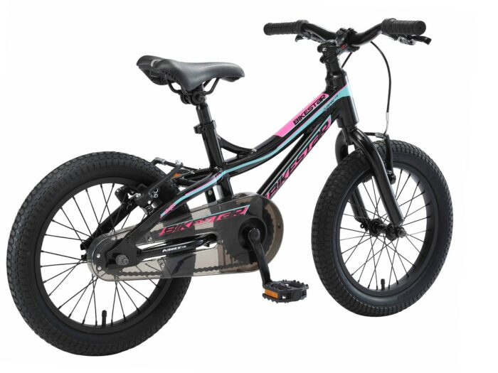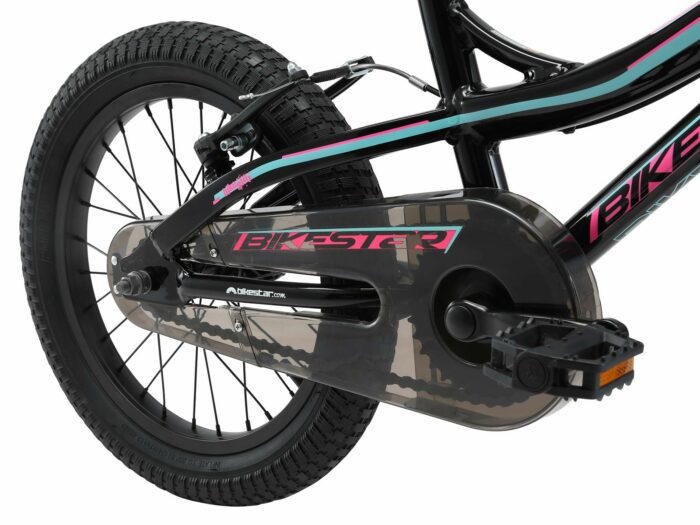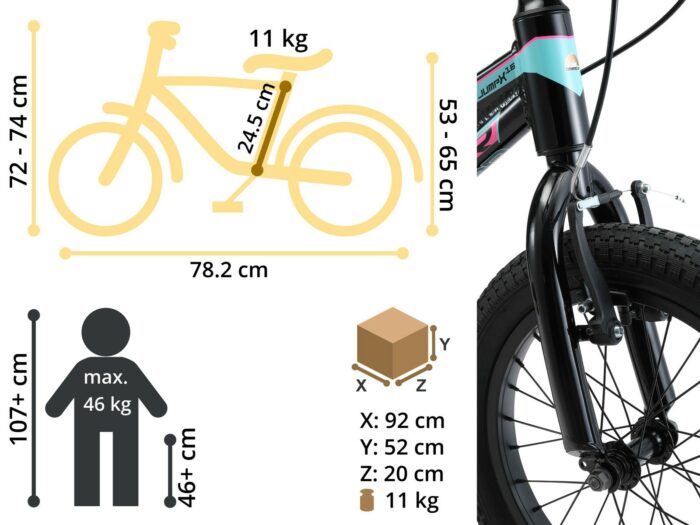 ** Vakmanschap ** Dankzij aluminium onderdelen is onze fiets bijzonder licht en dankzij de precieze afwerking ook extreem stabiel. Uiteraard voldoet de fiets aan de wettelijke normen en met een nauwkeurige eindcontrole garanderen wij een allround veilige en stabiele kinderfiets. Superlichte mountainbike met 1 versnelling, velgremmen en kettingkast ** Jong geleerd ** Deze fiets is geschikt voor kinderen vanaf 4 jaar en een lengte van 110cm. Door het in hoogte en helling verstelbare stuur en zadel kunnen kinderen lang fietsen – ook na een groeispurt. De ergonomie tussen zadel en stuur is zodanig dat kinderen altijd de juiste houding op de fiets aannemen, wat een gezonde ontwikkeling bevorderd. ** Specificaties ** – Leeftijd: vanaf ca. 4-5 jaar (110cm lengte) – Zadelhoogte: ca. 53-65 cm – Stuurhoogte: ca. 72-74 cm – Gewicht: 11 Kg – Licht maar stabiel aluminium frame met lage instap – Water- en stofdichte trapsas met vierkante CrMo as – Premium Design crank zoals op de duurste fietsen – 40.6 cm (16 inch) Luchtbanden op hoogwaardige aluminium velgen – Slagvaste meerlaagse lak – Makkelijk sturen met in hoogte en hellingshoek instelbaar stuur – Ergonomisch in hoogte en hellingshoek instelbaar zadel – V-brakes voor en achter met op kinderhanden aangepaste remgrepen