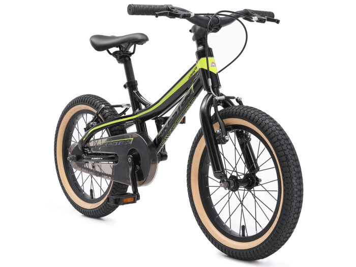 ** Vakmanschap ** Dankzij aluminium onderdelen is onze fiets bijzonder licht en dankzij de precieze afwerking ook extreem stabiel. Uiteraard voldoet de fiets aan de wettelijke normen en met een nauwkeurige eindcontrole garanderen wij een allround veilige en stabiele kinderfiets. Superlichte mountainbike met 1 versnelling, velgremmen en kettingkast ** Jong geleerd ** Deze fiets is geschikt voor kinderen vanaf 4 jaar en een lengte van 110cm. Door het in hoogte en helling verstelbare stuur en zadel kunnen kinderen lang fietsen – ook na een groeispurt. De ergonomie tussen zadel en stuur is zodanig dat kinderen altijd de juiste houding op de fiets aannemen, wat een gezonde ontwikkeling bevorderd. ** Specificaties ** – Leeftijd: vanaf ca. 4-5 jaar (110cm lengte) – Zadelhoogte: ca. 53-65 cm – Stuurhoogte: ca. 72-74 cm – Gewicht: 11 Kg – Licht maar stabiel aluminium frame met lage instap – Water- en stofdichte trapsas met vierkante CrMo as – Premium Design crank zoals op de duurste fietsen – 40.6 cm (16 inch) Luchtbanden op hoogwaardige aluminium velgen – Slagvaste meerlaagse lak – Makkelijk sturen met in hoogte en hellingshoek instelbaar stuur – Ergonomisch in hoogte en hellingshoek instelbaar zadel – V-brakes voor en achter met op kinderhanden aangepaste remgrepen
