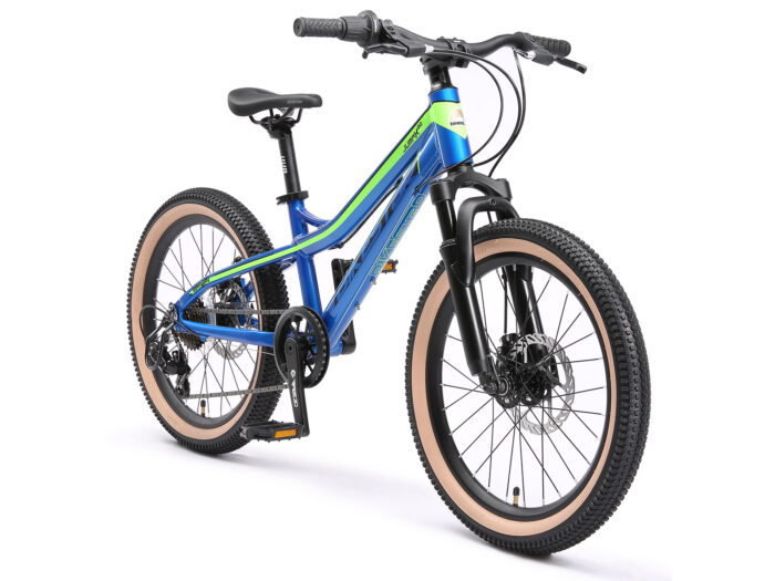 **Een veilige mountainbike** Zeer stabiel aluminium frame voor dagelijks gebruik op de berg, in de stad of op school. Met een bandenmaat van 20 inch en framemaat 11 inch is hij geschikt voor jongens of meisjes, vanaf ca. 125cm. Met het 7-speed Shimano derailleur-systeem met bijna naadloze schakeling kun je elke situatie aan. De bijzonder gripvaste V-brakes aan de voor- en achterkant zorgen voor de nodige controle. **Bikestar kwaliteit** Bikestar is gespecialiseerd in de productie van hoogwaardige fietsen die perfect op hun taak berekend zijn. Daarom worden alleen hoogwaardige componenten gebruikt, die bijdragen aan de veiligheid en duurzaamheid van de fiets. De fiets wordt 90%25 compleet gemonteerd afgeleverd. U dient zelf nog de pedalen, zadel en het voorwiel te monteren. U doet er goed aan de fiets voor het eerste gebruik door een fietsenmaker te laten controleren en de fiets om de zoveel maanden een onderhoudsbeurt te laten geven voor een lang en veilig gebruik. Bikestar staat al tien jaar voor een productontwerp dat de harten van kinderen inspireert. Met zijn merken BIKESTAR, STAR-SCOOTER en STAR-SKATEBOARDS heeft het bedrijf een reusachtig assortiment kindervoertuigen beschikbaar. De firma overtuigt door snelle levering en permanente beschikbaarheid van reserveonderdelen. **Specificaties** – Leeftijd: 6-9 jaar (vanaf 125cm lengte) – Zadelhoogte: ca. 58-68 cm – Stuurhoogte: ca. 75-77 cm – Gewicht: 13 Kg – Wielmaat 20 inch – Framehoogte: 11 inch (27,9 cm) – Versnellingen: 7 (Shimano) – Framemateriaal: 6061 aluminium – Geveerde voorvork met 55 mm veerweg – Derailleur: Shimano Tourney RD-TY 300 – Schakelaar: Shimano draaigreep – Remmen: schijfremmen – Ketting: KMC – Max. toegestaan gewicht: 50 Kg – 90%25 voorgemonteerd