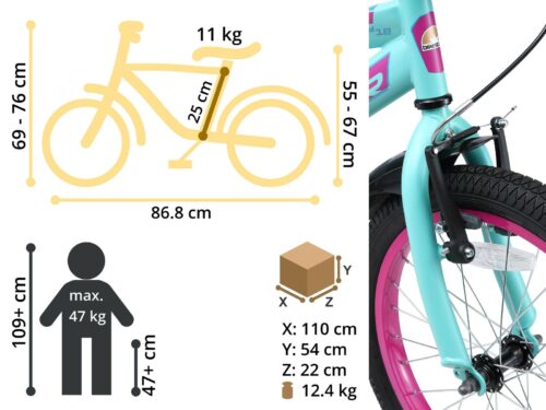** Jong geleerd ** Deze fiets is geschikt voor kinderen vanaf 5 jaar en een lengte van 115cm. Door het in hoogte en helling verstelbare stuur en zadel kunnen kinderen lang fietsen – ook na een groeispurt. De ergonomie tussen zadel en stuur is zodanig dat kinderen altijd de juiste houding op de fiets aannemen, wat een gezonde ontwikkeling bevorderd. ** Vakmanschap ** Dankzij aluminium onderdelen is onze fiets bijzonder licht en dankzij de precieze afwerking ook extreem stabiel. Uiteraard voldoet de fiets aan de wettelijke normen en met een nauwkeurige eindcontrole garanderen wij een allround veilige en stabiele kinderfiets. Voorzien van een afgedichte ISO- trapas waardoor de fiets altijd gemakkelijk trapt. ** Specificaties ** – Leeftijd: vanaf ca. 5 jaar (115cm lengte) – Zadelhoogte: ca. 54-66 cm – Stuurhoogte: ca. 69-77 cm – Gewicht: 11 Kg – Hoogwaardige, lichtlopende trapas zodat de fiets niet zwaar trapt – Stevig stalen frame met slagvaste laklaag – Stuur met kogellagers, in hoogte en hellingshoek instelbaar – Ergonomisch gevormd kinderzadel, in hoogte en hellingshoek instelbaar – Met terugtraprem – Gecertificeerde, gifvrije veiligheidshandgrepen – Voorwielrem met op kinderhandjes aangepaste, instelbare greep – Volledig gesloten kettingkast – Reflectoren aan voor- en achterzijde en aan de pedalen – 40.6cm (16 inch) Luchtbanden op hoogwaardige aluminium velgen – 95%25 voorgemonteerd, in circa 15 minuten af te monteren
