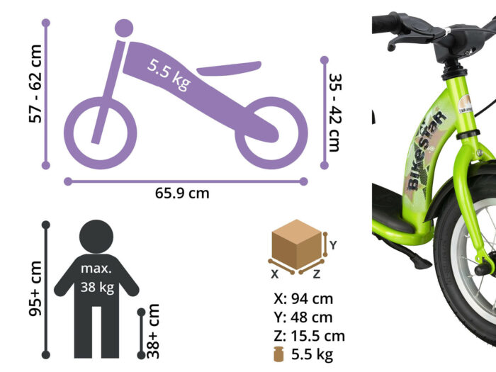 **De eerste stapjes van je kind of kleinkind zijn een wonder, niet in het minst voor het kindje zelf.** Ineens is er veel meer van de omgeving te zien en het kind valt van de ene verwondering in de andere. De eerste stapjes gaan moeizaam, met vallen en opstaan, maar al snel heeft je kindje de smaak te pakken en wil het je overal volgen, of misschien zelfs een eigen weg gaan. Tegen die tijd kan je overwegen het eerste loopfietsje aan te schaffen. Een loopfietsje leert het kindje het evenwicht bewaren, omgaan met de omgeving, sneller bewegen dan lopen en levert daarbij een hele hoop plezier. Bikestar, een bekende fabrikant uit Duitsland, biedt een keur aan loopfietsjes aan. Van hout, van aluminium en andere metalen, met massieve bandjes en luchtbandjes. Voor de allerjongste en ondernemende kinderen vanaf 18 maanden zijn er tot tweewielers om te bouwen driewielers. Voor de stoertjes zijn er MTB-loopfietsjes met 12 inch wielen. Het aanbod is kleurrijk en heel divers, maar altijd is er gelet op de grootste veiligheid in materiaalkeuze, bouwkwaliteit en ergonomie. Een feest voor het kind, een hele geruststelling voor de (groot)ouders. **Licht, stabiel en veilig** Dit loopfietsje weegt niet veel maar is toch stabiel en veilig. Het kind kan met dit fietsje beginnen de wereld te ontdekken. Alle gebruikte materialen, ook de lak en handgrepen, voldoen aan de wettelijke normen van veiligheid en zijn dus gifvrij en van onberispelijke kwaliteit. **Een fantastische ervaring** Met een loopfietsje krijgt het kind de vrijheid om zelf te gaan waar het wil, leert het het evenwicht te bewaren, en leert het omgaan met snelheid. **Specificaties** – Leeftijd: vanaf ca. 3 jaar (93cm lengte) – Zadelhoogte: ca. 35-42 cm – Stuurhoogte: ca. 57-62 cm – Gewicht: 5,5 Kg – Solide stalen frame met meerdere slagvaste laklagen – Stuur met uitslagbegrenzing – In hoogte en hoek verstelbaar stuur met polstering – Gifvrije veiligheidshandgrepen – Handrem op het achterwiel met kindermaat handgreep – Extra dikke 12 inch luchtbanden voor lekkere vering. – Standaard uitgerust met een zijstandaard – 85%25 voorgemonteerd, afmontage neemt ca 10 minuten in beslag