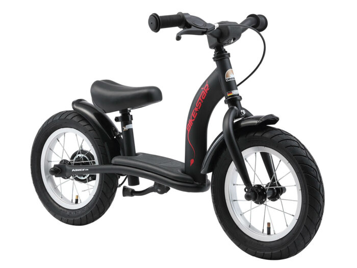 **De eerste stapjes van je kind of kleinkind zijn een wonder, niet in het minst voor het kindje zelf.** Ineens is er veel meer van de omgeving te zien en het kind valt van de ene verwondering in de andere. De eerste stapjes gaan moeizaam, met vallen en opstaan, maar al snel heeft je kindje de smaak te pakken en wil het je overal volgen, of misschien zelfs een eigen weg gaan. Tegen die tijd kan je overwegen het eerste loopfietsje aan te schaffen. Een loopfietsje leert het kindje het evenwicht bewaren, omgaan met de omgeving, sneller bewegen dan lopen en levert daarbij een hele hoop plezier. Bikestar, een bekende fabrikant uit Duitsland, biedt een keur aan loopfietsjes aan. Van hout, van aluminium en andere metalen, met massieve bandjes en luchtbandjes. Voor de allerjongste en ondernemende kinderen vanaf 18 maanden zijn er tot tweewielers om te bouwen driewielers. Voor de stoertjes zijn er MTB-loopfietsjes met 12 inch wielen. Het aanbod is kleurrijk en heel divers, maar altijd is er gelet op de grootste veiligheid in materiaalkeuze, bouwkwaliteit en ergonomie. Een feest voor het kind, een hele geruststelling voor de (groot)ouders. **Licht, stabiel en veilig** Dit loopfietsje weegt niet veel maar is toch stabiel en veilig. Het kind kan met dit fietsje beginnen de wereld te ontdekken. Alle gebruikte materialen, ook de lak en handgrepen, voldoen aan de wettelijke normen van veiligheid en zijn dus gifvrij en van onberispelijke kwaliteit. **Een fantastische ervaring** Met een loopfietsje krijgt het kind de vrijheid om zelf te gaan waar het wil, leert het het evenwicht te bewaren, en leert het omgaan met snelheid. **Specificaties** – Leeftijd: vanaf ca. 3 jaar (93cm lengte) – Zadelhoogte: ca. 35-42 cm – Stuurhoogte: ca. 57-62 cm – Gewicht: 5,5 Kg – Solide stalen frame met meerdere slagvaste laklagen – Stuur met uitslagbegrenzing – In hoogte en hoek verstelbaar stuur met polstering – Gifvrije veiligheidshandgrepen – Handrem op het achterwiel met kindermaat handgreep – Extra dikke 12 inch luchtbanden voor lekkere vering. – Standaard uitgerust met een zijstandaard – 85%25 voorgemonteerd, afmontage neemt ca 10 minuten in beslag