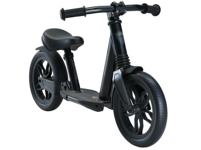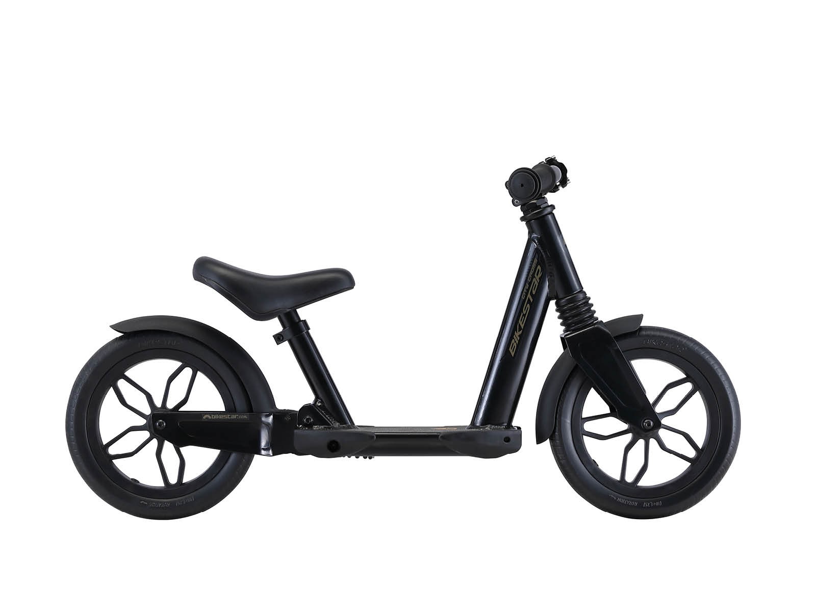 **De eerste stapjes van je kind of kleinkind zijn een wonder, niet in het minst voor het kindje zelf.** Ineens is er veel meer van de omgeving te zien en het kind valt van de ene verwondering in de andere. De eerste stapjes gaan moeizaam, met vallen en opstaan, maar al snel heeft je kindje de smaak te pakken en wil het je overal volgen, of misschien zelfs een eigen weg gaan. Tegen die tijd kan je overwegen het eerste loopfietsje aan te schaffen. Een loopfietsje leert het kindje het evenwicht bewaren, omgaan met de omgeving, sneller bewegen dan lopen en levert daarbij een hele hoop plezier. Bikestar, een bekende fabrikant uit Duitsland, biedt een keur aan loopfietsjes aan. Van hout, van aluminium en andere metalen, met massieve bandjes en luchtbandjes. Voor de allerjongste en ondernemende kinderen vanaf 18 maanden zijn er tot tweewielers om te bouwen driewielers. Voor de stoertjes zijn er MTB-loopfietsjes met 12 inch wielen. Het aanbod is kleurrijk en heel divers, maar altijd is er gelet op de grootste veiligheid in materiaalkeuze, bouwkwaliteit en ergonomie. Een feest voor het kind, een hele geruststelling voor de (groot)ouders. **Licht, stabiel en veilig** Dit loopfietsje weegt niet veel maar is toch stabiel en veilig. Het kind kan met dit fietsje beginnen de wereld te ontdekken. Alle gebruikte materialen, ook de lak en handgrepen, voldoen aan de wettelijke normen van veiligheid en zijn dus gifvrij en van onberispelijke kwaliteit. **Een fantastische ervaring** Met een loopfietsje krijgt het kind de vrijheid om zelf te gaan waar het wil, leert het het evenwicht te bewaren, en leert het omgaan met snelheid. **Full suspension** Waarschijnlijk de enige volledig geveerde kinderloopfiets op de markt! Een geveerde voorvork plus vering aan de achterzijde. **Specificaties** – Leeftijd: vanaf ca. 2 jaar (85cm lengte) – Zadelhoogte: ca. 30-37 cm – Stuurhoogte: ca. 45-47 cm – Gewicht: 3 Kg – Volledig geveerd – voor en achter – voor comfortabele ritjes – In hoogte verstelbaar stuur en zadel – Superlichtgewicht 3 Kg loopfietsje – Solide aluminium frame, zeer licht maar zeer stevig – Licht draaiend stuur – Vanzelfsprekend zijn alleen hoogwaardige, gifvrije onderdelen gebruikt – Comfortabele 10 inch antilek EVA banden – 90%25 voorgemonteerd, de afmontage neemt ca 10 minuten in beslag