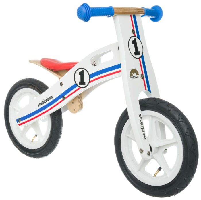 **De eerste stapjes van je kind of kleinkind zijn een wonder, niet in het minst voor het kindje zelf. ** Ineens is er veel meer van de omgeving te zien en het kind valt van de ene verwondering in de andere. De eerste stapjes gaan moeizaam, met vallen en opstaan, maar al snel heeft je kindje de smaak te pakken en wil het met je overal volgen, of misschien zelfs een eigen weg gaan. Tegen die tijd kan je overwegen het eerste loopfietsje aan te schaffen. Een loopfietsje leert het kindje het evenwicht bewaren, omgaan met de omgeving, sneller bewegen dan lopen en levert daarbij een hele hoop plezier. Bikestar, een bekende fabrikant uit Duitsland, biedt een keur aan loopfietsjes aan. Van hout, van aluminium en andere metalen, met massieve bandjes en luchtbandjes. Voor de allerjongste en ondernemende kinderen vanaf 18 maanden zijn er tot tweewielers om te bouwen driewielers. Voor de stoertjes zijn er MTB-loopfietsjes met 12 inch wielen. Het aanbod is kleurrijk en heel divers, maar altijd is er gelet op de grootste veiligheid in materiaalkeuze, bouwkwaliteit en ergonomie. Een feest voor het kind, een hele geruststelling voor de (groot)ouders. Leeftijd: vanaf ca. 3 jaar (93 cm lengte) zadelhoogte: ca. 37-43 cm | stuurhoogte: ca. 55 cm | gewicht: ca. 4 Kg Licht maar zeer stabiel berkenhouten frame Slagvaste lak op waterbasis Stuur met uitslagbegrenzing Veiligheidshandgrepen, verminderen kans op verwondingen 12 inch luchtbanden voor lekkere vering. Ergonomisch in hoogte verstelbaar loopfietszadel 95%25 voorgemonteerd, afmontage neemt ca 10 minuten in beslag