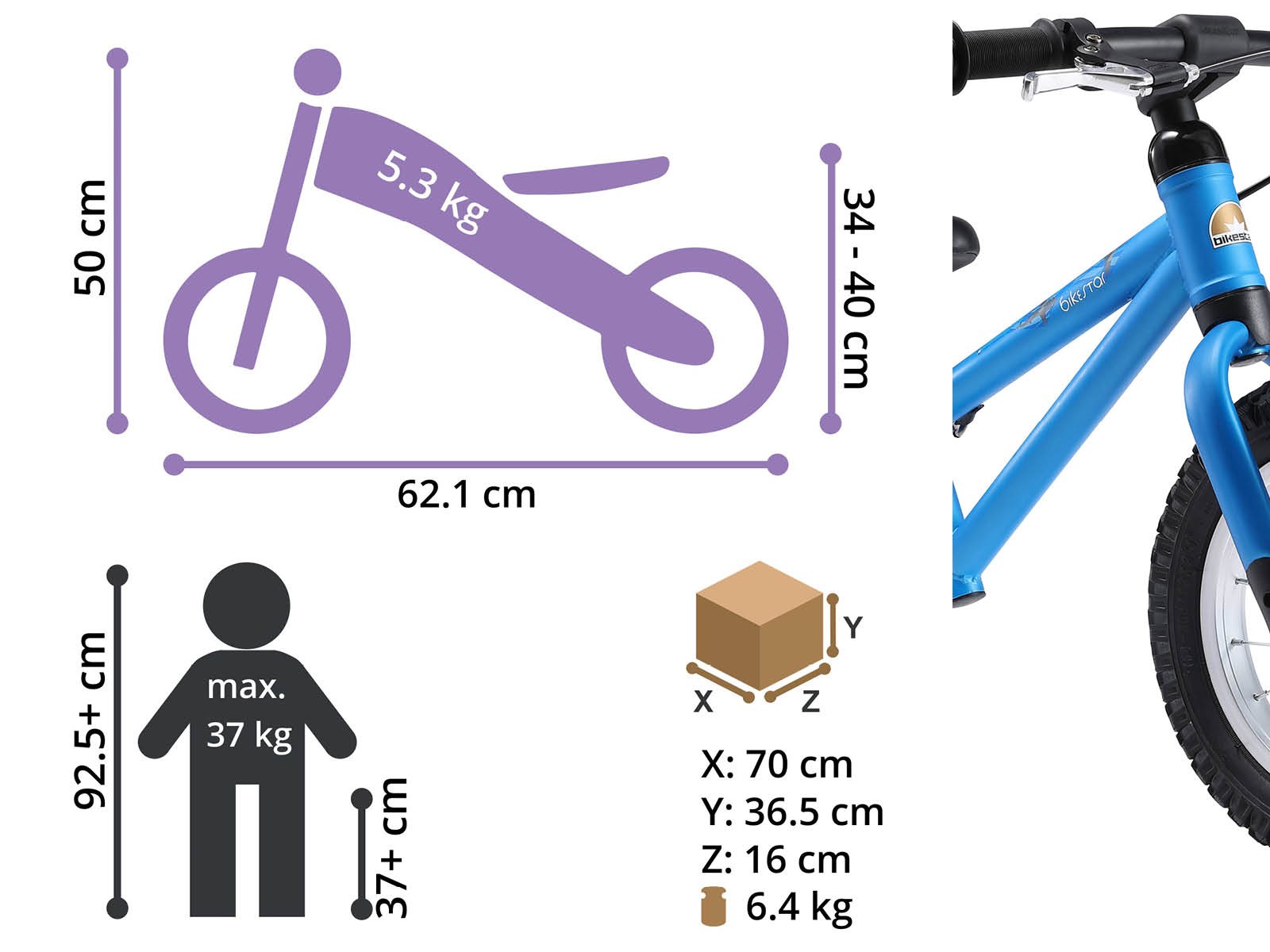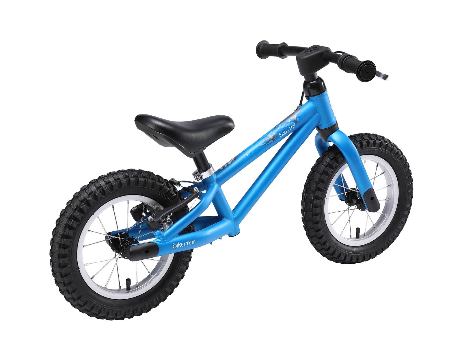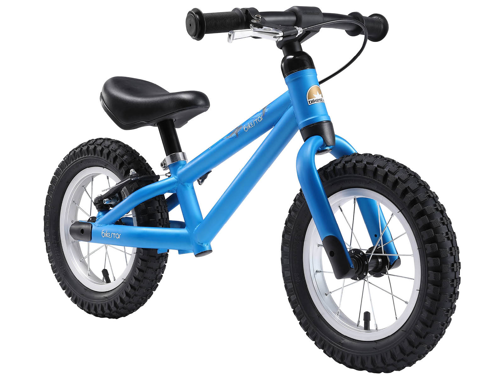 **De eerste stapjes van je kind of kleinkind zijn een wonder, niet in het minst voor het kindje zelf.** Ineens is er veel meer van de omgeving te zien en het kind valt van de ene verwondering in de andere. De eerste stapjes gaan moeizaam, met vallen en opstaan, maar al snel heeft je kindje de smaak te pakken en wil het je overal volgen, of misschien zelfs een eigen weg gaan. Tegen die tijd kan je overwegen het eerste loopfietsje aan te schaffen. Een loopfietsje leert het kindje het evenwicht bewaren, omgaan met de omgeving, sneller bewegen dan lopen en levert daarbij een hele hoop plezier. Bikestar, een bekende fabrikant uit Duitsland, biedt een keur aan loopfietsjes aan. Van hout, van aluminium en andere metalen, met massieve bandjes en luchtbandjes. Voor de allerjongste en ondernemende kinderen vanaf 18 maanden zijn er tot tweewielers om te bouwen driewielers. Voor de stoertjes zijn er MTB-loopfietsjes met 12 inch wielen. Het aanbod is kleurrijk en heel divers, maar altijd is er gelet op de grootste veiligheid in materiaalkeuze, bouwkwaliteit en ergonomie. Een feest voor het kind, een hele geruststelling voor de (groot)ouders. **Stoer, stabiel en veilig** Dit loopfietsje met stabiel en veilig mountainbikeframe helpt het kind de wereld te ontdekken. Alle gebruikte materialen, ook de lak en handgrepen, voldoen aan de wettelijke normen van veiligheid en zijn dus gifvrij en van onberispelijke kwaliteit. **Een fantastische ervaring** Met een loopfietsje krijgt het kind de vrijheid om zelf te gaan waar het wil, leert het het evenwicht te bewaren, en leert het omgaan met snelheid. **Specificaties** – Leeftijd: vanaf ca. 3-4 jaar (93cm lengte) – Zadelhoogte: ca. 33-37 cm – Stuurhoogte: ca. 49 cm – Gewicht: 5,3 Kg – Solide stalen frame met meerdere slagvaste laklagen – Stuur met uitslagbegrenzing – Gifvrije veiligheidshandgrepen – Handrem op het achterwiel met kindermaat handgreep – Extra dikke 12 inch luchtbanden voor lekkere vering. – 85%25 voorgemonteerd, afmontage neemt ca 10 minuten in beslag