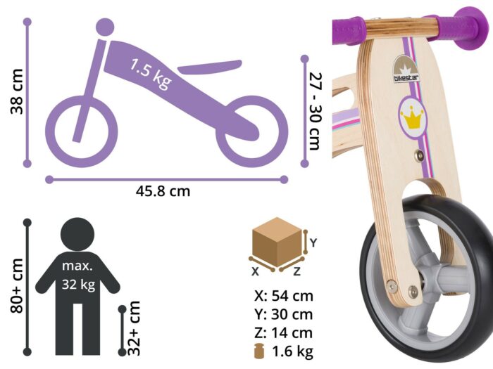 **De eerste stapjes van je kind of kleinkind zijn een wonder, niet in het minst voor het kindje zelf.** Ineens is er veel meer van de omgeving te zien en het kind valt van de ene verwondering in de andere. De eerste stapjes gaan moeizaam, met vallen en opstaan, maar al snel heeft je kindje de smaak te pakken en wil het met je overal volgen, of misschien zelfs een eigen weg gaan. Tegen die tijd kan je overwegen het eerste loopfietsje aan te schaffen. Een loopfietsje leert het kindje het evenwicht bewaren, omgaan met de omgeving, sneller bewegen dan lopen en levert daarbij een hele hoop plezier. Bikestar, een bekende fabrikant uit Duitsland, biedt een keur aan loopfietsjes aan. Van hout, van aluminium en andere metalen, met massieve bandjes en luchtbandjes. Voor de allerjongste en ondernemende kinderen vanaf 18 maanden zijn er tot tweewielers om te bouwen driewielers. Voor de stoertjes zijn er MTB-loopfietsjes met 12 inch wielen. Het aanbod is kleurrijk en heel divers, maar altijd is er gelet op de grootste veiligheid in materiaalkeuze, bouwkwaliteit en ergonomie. Een feest voor het kind, een hele geruststelling voor de (groot)ouders. **Houten frame met slim design** Zeer stabiel houten frame met slagvaste verf op waterbasis en in hoogte verstelbaar zadel. Begin als driewieler, bouw om naar tweewieler. Duurzaam en natuurlijk, met gecertificeerde, niet-giftige veiligheidsgrepen met bescherming tegen stoten en 7 inch massieve banden met kunststof velgen. Met een loopfietsje krijgt het kind de vrijheid om zelf te gaan waar het wil, leert het het evenwicht te bewaren, en leert het omgaan met snelheid. **Specificaties** -Leeftijd: vanaf ca. 18 maanden (vanaf ca. 77 cm tot maximaal 90 cm lengte) – zadelhoogte: ca. 26-28 cm – stuurhoogte: ca. 38 cm – gewicht: ca. 1,6 Kg – Bijzonder klein maar robuust loopfietsje voor de vroege lopers. – Eenvoudig om te bouwen van 3 naar 2 wielen – Lichtgewicht houten frame met sterke laklaag – Stuur met uitslagbegrenzing – Gecertificeerde, gifvrije veiligheidshandgrepen – Extra brede 7 inch massieve EVA banden op kunststof velgen – Uitgerust met een comfortabel, in hoogte verstelbaar loopfietszadel – 95%25 voorgemonteerd, afmontage neemt ca 10 minuten in beslag