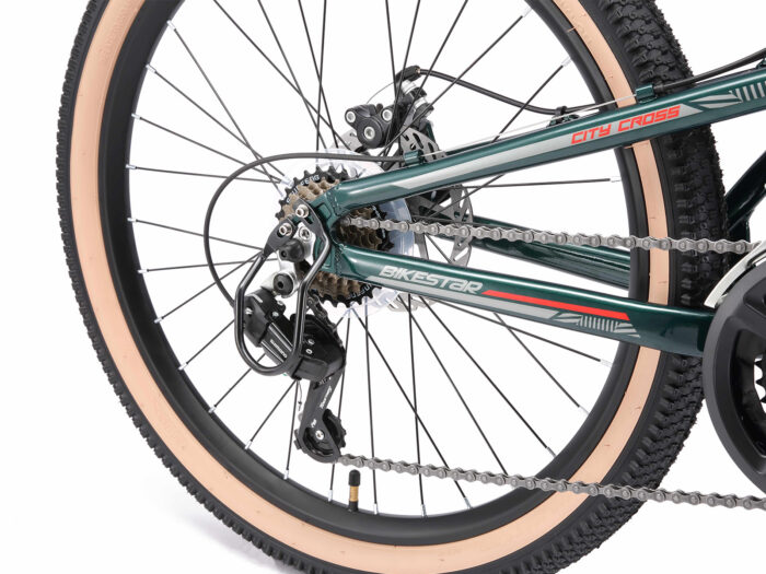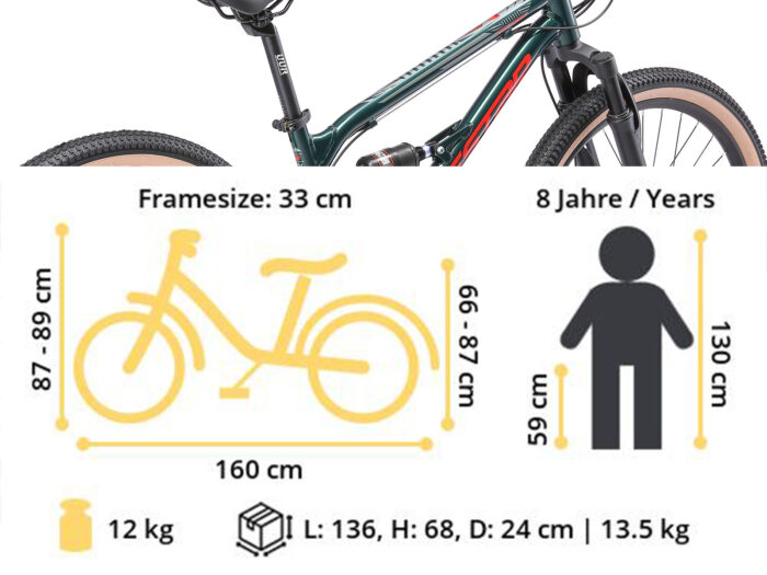** Full suspension mountainbike ** Zeer stabiel aluminium frame voor dagelijks gebruik op de berg, in de stad of op school. Met een bandenmaat van 24 inch en framemaat 13 inch is hij geschikt voor jongens of meisjes, vanaf ca. 140cm. Met het 21-speed Shimano derailleur-systeem met bijna naadloze schakeling kun je elke situatie aan. De bijzonder gripvaste schijfremmen aan de voor- en achterkant zorgen voor de nodige controle. De fiets heeft een geveerde voorvork met 55 mm veerweg en een geveerde achterbrug. ** Bikestar kwaliteit ** Bikestar is gespecialiseerd in de productie van hoogwaardige fietsen die perfect op hun taak berekend zijn. Daarom worden alleen hoogwaardige componenten gebruikt, die bijdragen aan de veiligheid en duurzaamheid van de fiets. De fiets wordt 90%25 compleet gemonteerd afgeleverd. U dient zelf nog de pedalen, zadel en het voorwiel te monteren. U doet er goed aan de fiets voor het eerste gebruik door een fietsenmaker te laten controleren en de fiets om de zoveel maanden een onderhoudsbeurt te laten geven voor een lang en veilig gebruik. Bikestar staat al tien jaar voor een productontwerp dat de harten van kinderen inspireert. Met zijn merken BIKESTAR, STAR-SCOOTER en STAR-SKATEBOARDS heeft het bedrijf een reusachtig assortiment kindervoertuigen beschikbaar. De firma overtuigt door snelle levering en permanente beschikbaarheid van reserveonderdelen. ** Specificaties ** – Leeftijd: 10-13 jaar (vanaf 140cm lengte) – Zadelhoogte: ca. 67-77 cm – Stuurhoogte: ca. 87-89 cm – Gewicht: 12 Kg – Wielmaat 24 inch – Framehoogte: 13 inch (33 cm) – Versnellingen: 21 (Shimano) – Framemateriaal: 6061 aluminium – Geveerde voorvork met 55 mm veerweg – Derailleur: Shimano Tourney RD-TY21 – Schakelaar: Shimano draaigreep – Cassette: Shimano MF-TZ500 – Remmen: schijfremmen – Ketting: KMC – Max. toegestaan gewicht: 70 Kg – 90%25 voorgemonteerd