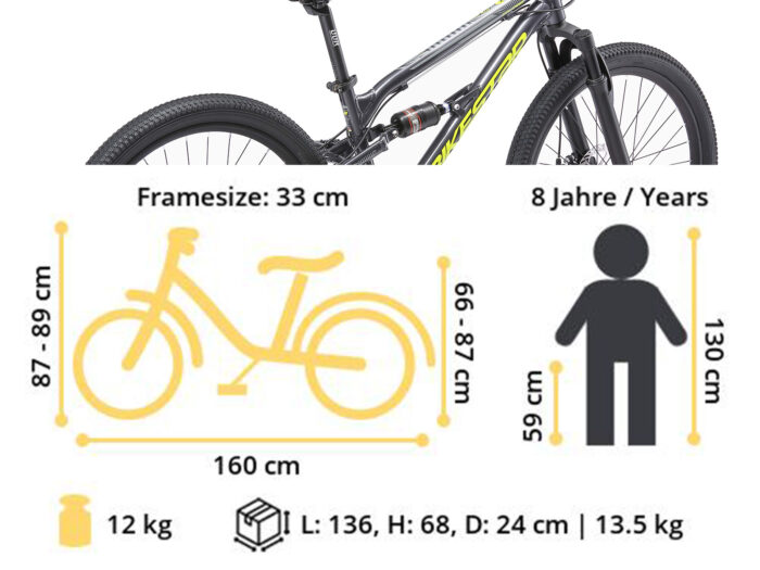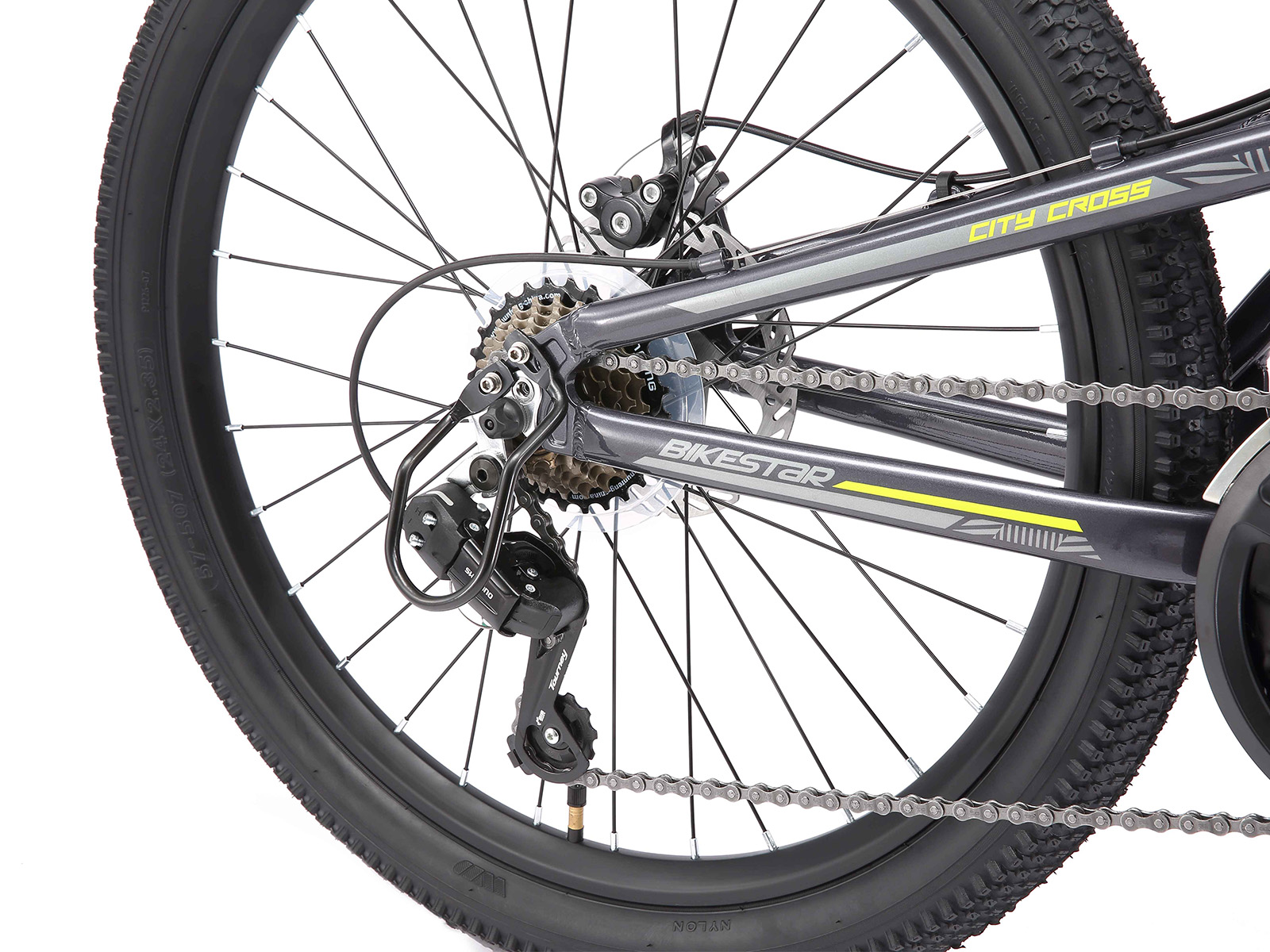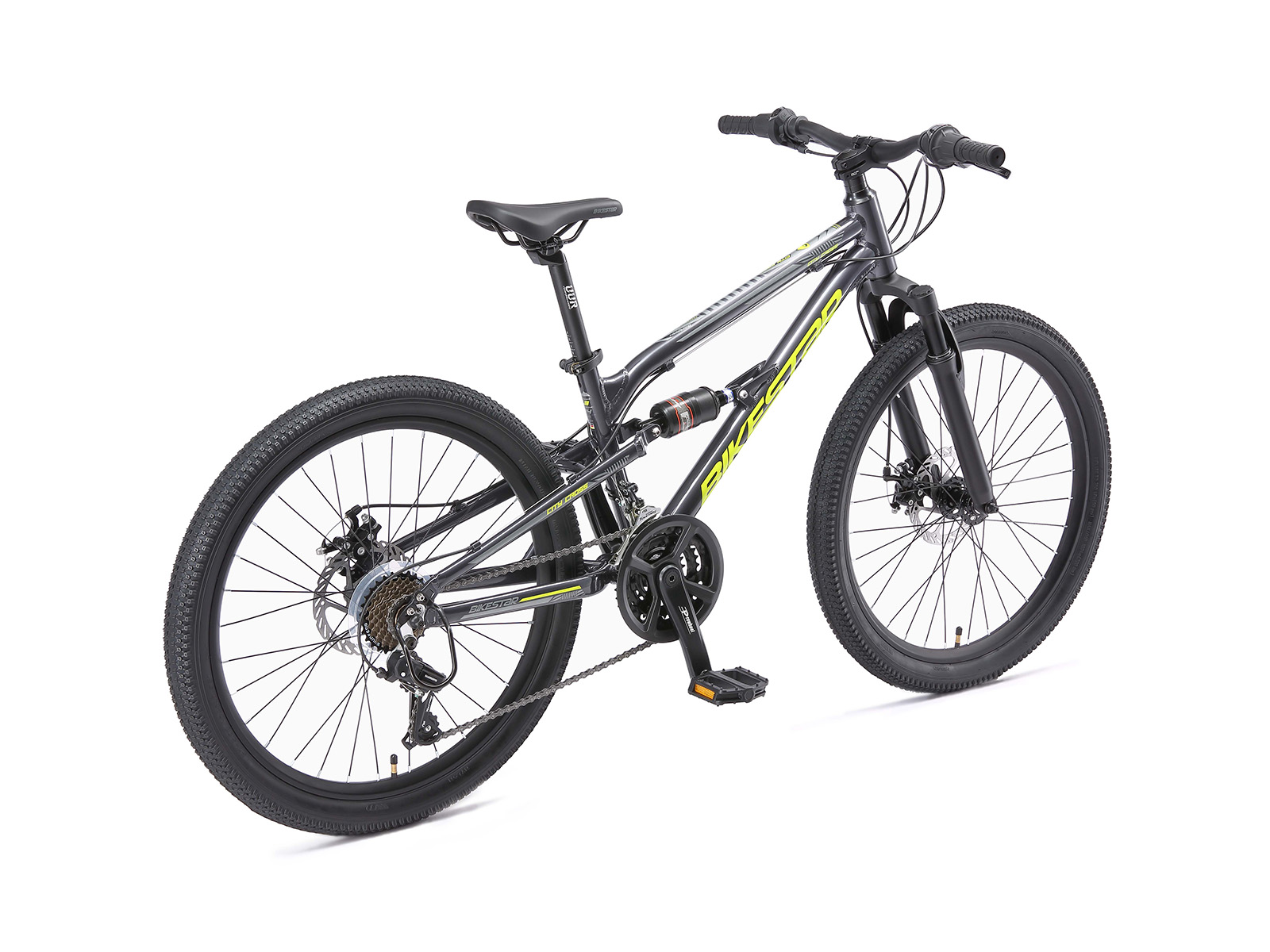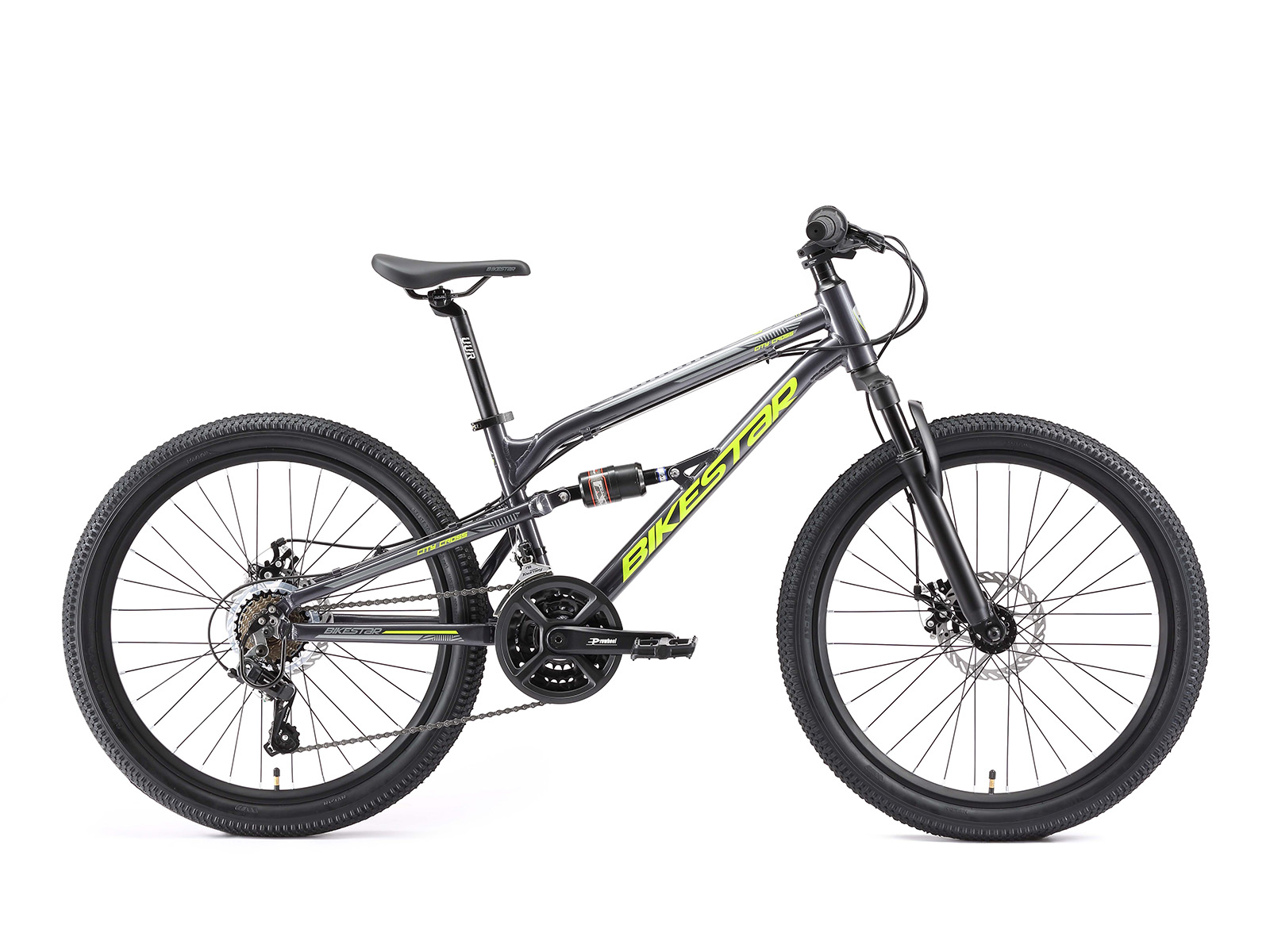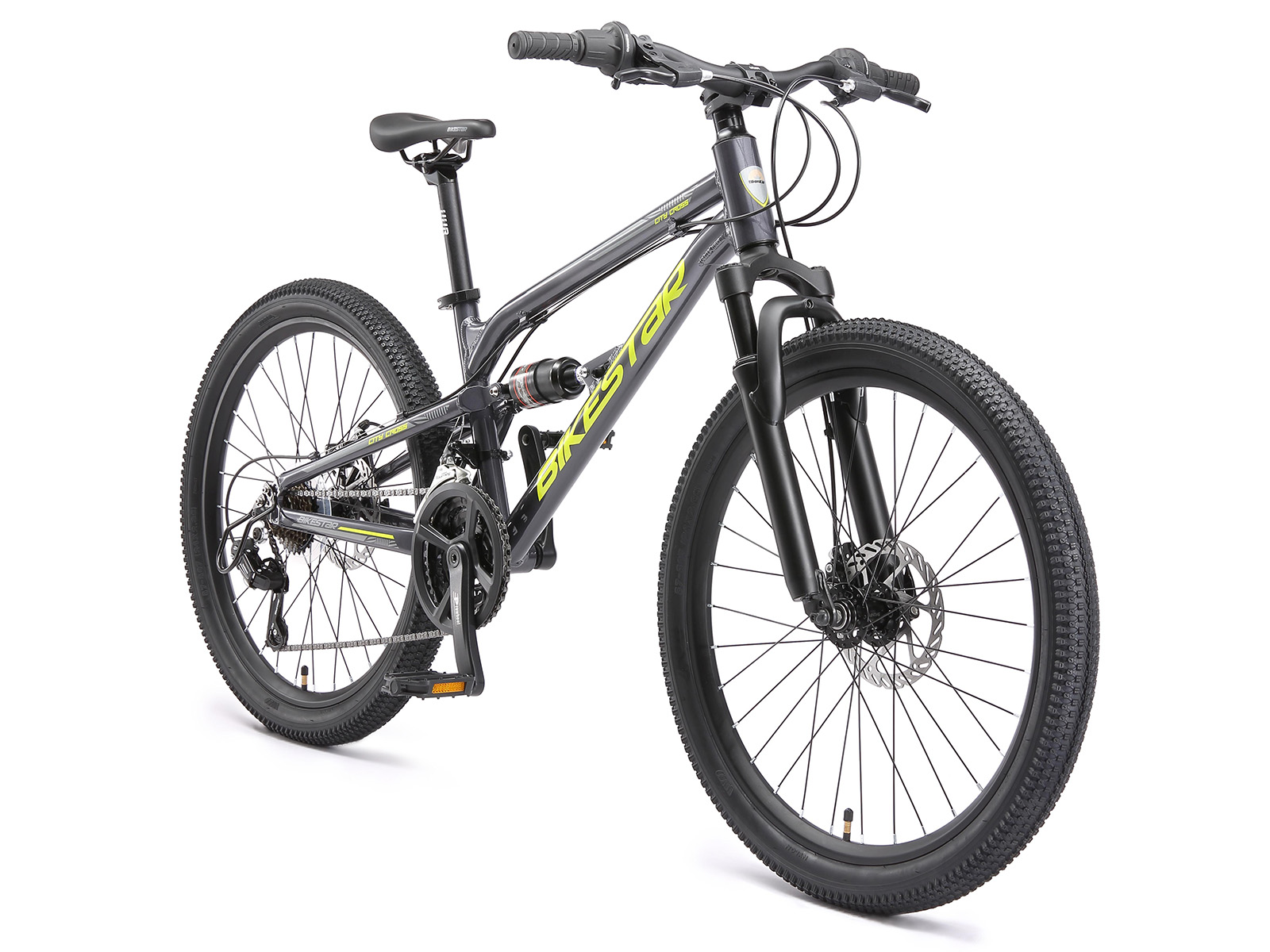 ** Full suspension mountainbike ** Zeer stabiel aluminium frame voor dagelijks gebruik op de berg, in de stad of op school. Met een bandenmaat van 24 inch en framemaat 13 inch is hij geschikt voor jongens of meisjes, vanaf ca. 140cm. Met het 21-speed Shimano derailleur-systeem met bijna naadloze schakeling kun je elke situatie aan. De bijzonder gripvaste schijfremmen aan de voor- en achterkant zorgen voor de nodige controle. De fiets heeft een geveerde voorvork met 55 mm veerweg en een geveerde achterbrug. ** Bikestar kwaliteit ** Bikestar is gespecialiseerd in de productie van hoogwaardige fietsen die perfect op hun taak berekend zijn. Daarom worden alleen hoogwaardige componenten gebruikt, die bijdragen aan de veiligheid en duurzaamheid van de fiets. De fiets wordt 90%25 compleet gemonteerd afgeleverd. U dient zelf nog de pedalen, zadel en het voorwiel te monteren. U doet er goed aan de fiets voor het eerste gebruik door een fietsenmaker te laten controleren en de fiets om de zoveel maanden een onderhoudsbeurt te laten geven voor een lang en veilig gebruik. Bikestar staat al tien jaar voor een productontwerp dat de harten van kinderen inspireert. Met zijn merken BIKESTAR, STAR-SCOOTER en STAR-SKATEBOARDS heeft het bedrijf een reusachtig assortiment kindervoertuigen beschikbaar. De firma overtuigt door snelle levering en permanente beschikbaarheid van reserveonderdelen. ** Specificaties ** – Leeftijd: 10-13 jaar (vanaf 140cm lengte) – Zadelhoogte: ca. 67-77 cm – Stuurhoogte: ca. 87-89 cm – Gewicht: 12 Kg – Wielmaat 24 inch – Framehoogte: 13 inch (33 cm) – Versnellingen: 21 (Shimano) – Framemateriaal: 6061 aluminium – Geveerde voorvork met 55 mm veerweg – Derailleur: Shimano Tourney RD-TY21 – Schakelaar: Shimano draaigreep – Cassette: Shimano MF-TZ500 – Remmen: schijfremmen – Ketting: KMC – Max. toegestaan gewicht: 70 Kg – 90%25 voorgemonteerd