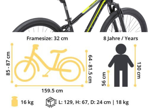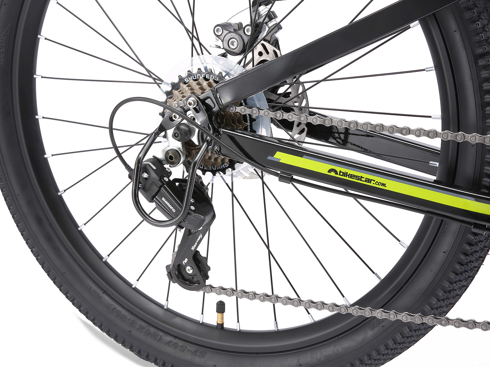 ** Een veilige mountainbike ** Zeer stabiel aluminium frame voor dagelijks gebruik op de berg, in de stad of op school. Met een bandenmaat van 24 inch en framemaat 12,5 inch is hij geschikt voor jongens of meisjes, vanaf ca. 130cm. Met het 21-speed Shimano derailleur-systeem met bijna naadloze schakeling kun je elke situatie aan. De bijzonder gripvaste schijfremmen aan de voor- en achterkant zorgen voor de nodige controle. ** Bikestar kwaliteit ** Bikestar is gespecialiseerd in de productie van hoogwaardige fietsen die perfect op hun taak berekend zijn. Daarom worden alleen hoogwaardige componenten gebruikt, die bijdragen aan de veiligheid en duurzaamheid van de fiets. De fiets wordt 90%25 compleet gemonteerd afgeleverd. U dient zelf nog de pedalen, zadel en het voorwiel te monteren. U doet er goed aan de fiets voor het eerste gebruik door een fietsenmaker te laten controleren en de fiets om de zoveel maanden een onderhoudsbeurt te laten geven voor een lang en veilig gebruik. Bikestar staat al tien jaar voor een productontwerp dat de harten van kinderen inspireert. Met zijn merken BIKESTAR, STAR-SCOOTER en STAR-SKATEBOARDS heeft het bedrijf een reusachtig assortiment kindervoertuigen beschikbaar. De firma overtuigt door snelle levering en permanente beschikbaarheid van reserveonderdelen. ** Specificaties ** – Leeftijd: 9-13 jaar (vanaf 130cm lengte) – Zadelhoogte: ca. 64-81 cm – Stuurhoogte: ca. 85-87 cm – Gewicht: 16 Kg – Wielmaat 24 inch – Framehoogte: 12,5 inch (32 cm) – Versnellingen: 21 (Shimano) – Framemateriaal: 6061 aluminium – Geveerde voorvork met 55 mm veerweg – Derailleur: Shimano Tourney RD-TY300 – Schakelaar: Shimano draaigreep – Cassette: Shimano MF-TZ500 – Remmen: schijfremmen – Ketting: Shimano TZ-21 – Max. toegestaan gewicht: 70 Kg – 90%25 voorgemonteerd