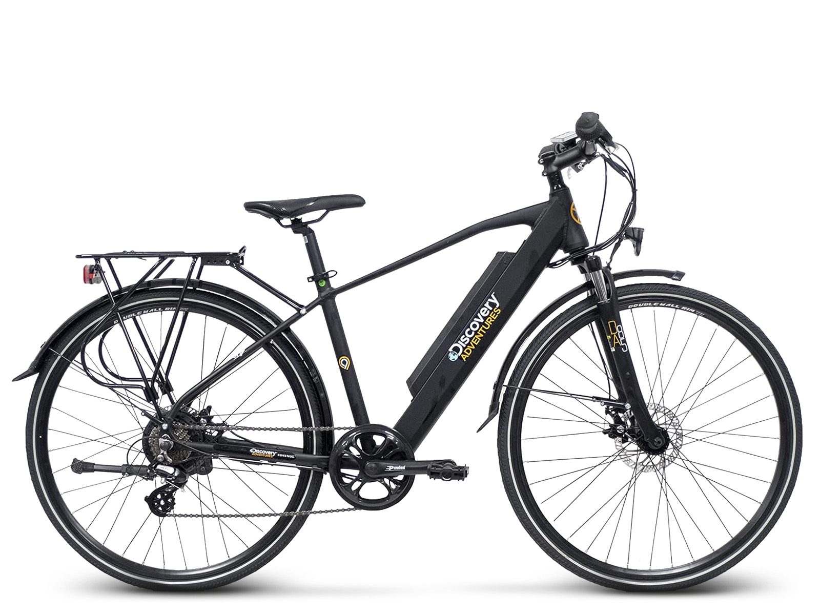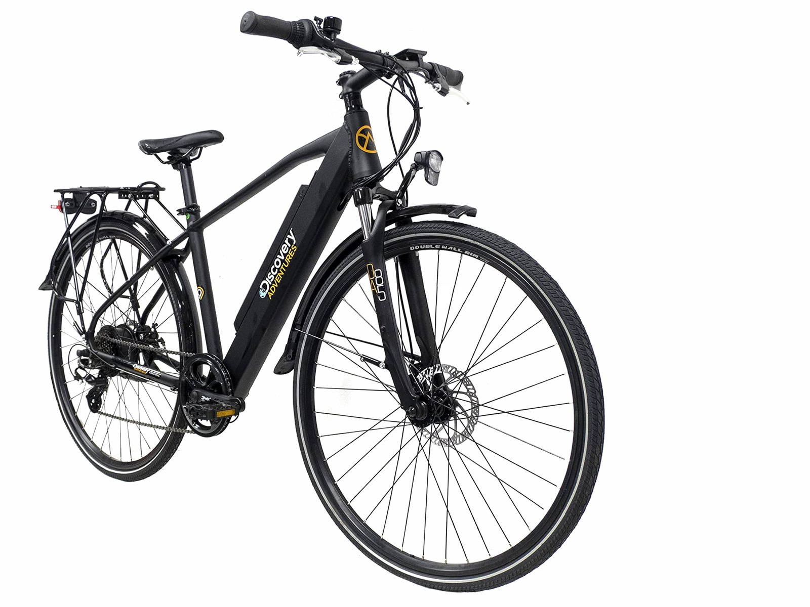 Met de Discovery E8200 is het heel gemakkelijk om je omgeving te ontdekken. Dankzij de elektrische trapondersteuning met 6 niveaus kun je naar wens zonder veel inspanning grote afstanden afleggen of er juist voor kiezen om vooral zelf te trappen. De 11.6 Ah accu is uitneembaar en ook buiten de fiets op te laden. In het gunstigste geval, dat wil zeggen met veel eigen inbreng, wind mee en weinig bagage, kan de elektrisch ondersteunde actieradius zo’n 80 kilometer bedragen. Omdat de fiets is voorzien van een soepel schakelende Shimano Altus derailleur en 7 versnellingen kun je er ook zonder trapondersteuning heerlijk mee toeren. Het informatieve LCD scherm op het stuur toont o.a. je snelheid, afgelegde afstand en de status van de accu. Je stelt er de ondersteuningsstand mee in en activeert desgewenst de Walk Assist functie. De fiets is opgebouwd met voornamelijk lichtgewicht aluminium delen, waardoor het fietsgewicht onder de 22 kilo blijft, inclusief de accu. De MXUS achterwielmotor levert 34 Nm trekkracht, die je met de schijfremmen in voor- en achterwiel kunt beteugelen. BIj het gebruik van de remmen wordt de motorondersteuning direct onderbroken. De geveerde voorvork vangt de klappen op als je over hobbelige wegen fietst. Het aluminium frame is voorzien van een bovenbuis, maar dat wil niet zeggen dat deze fiets alleen voor mannen is gedacht. Wel geeft de bovenbuis extra stabiliteit aan het frame, waardoor je snel en accuraat kunt sturen en de fiets ook op hoge snelheid heel solide aanvoelt. De 28 inch aluminium dubbelwandige velgen zijn voorzien van 38 mm brede banden met reflectiestrepen en binnenbanden met autoventielen. Kunststof spatborden houden opspattend water en straatvuil tegen, zodat je de fiets met een gerust hart ook kunt gebruiken voor woon-werkverkeer. Deze multi-inzetbare ebike voelt zich thuis op de weg in stad en dorp, maar schuwt ook een half verhard pad door de velden niet. Een fiets die het credo waar voor zijn geld waarmaakt, prima voor school, werk, vrijetijd en dagelijks gebruik.